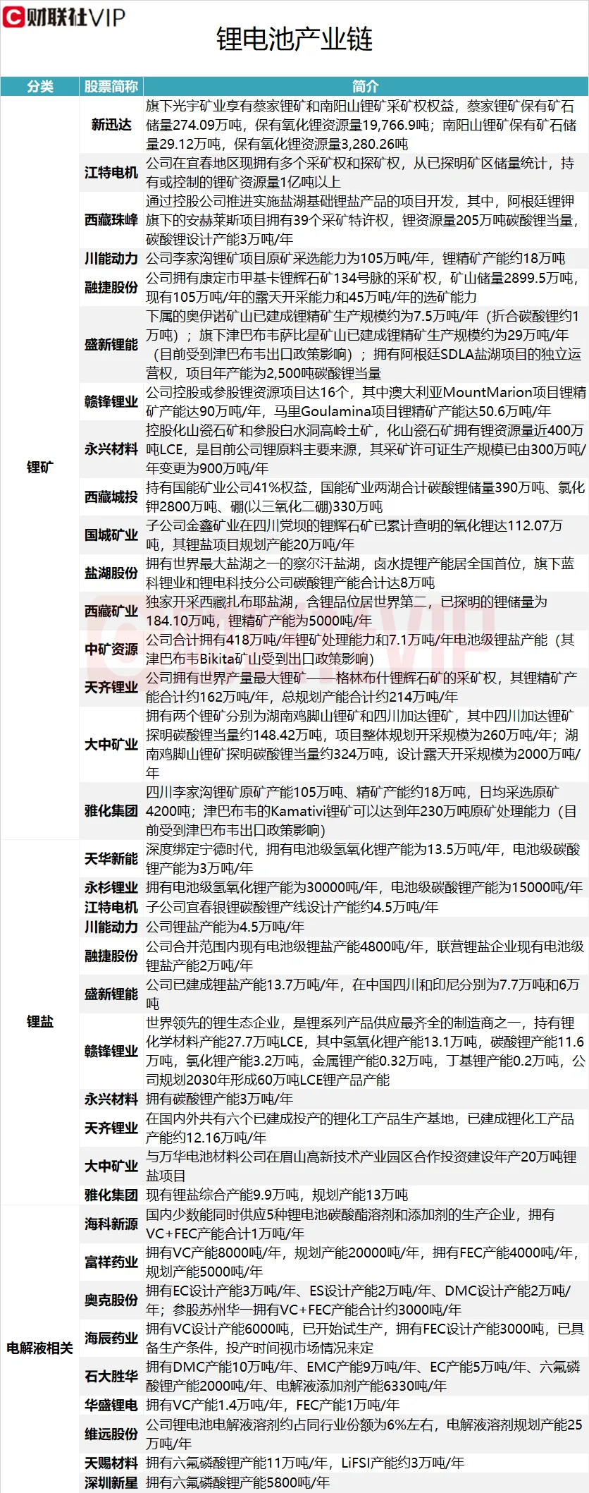 ②梳理锂电池产业链中锂矿上市公司名单及具体情况(附表)。