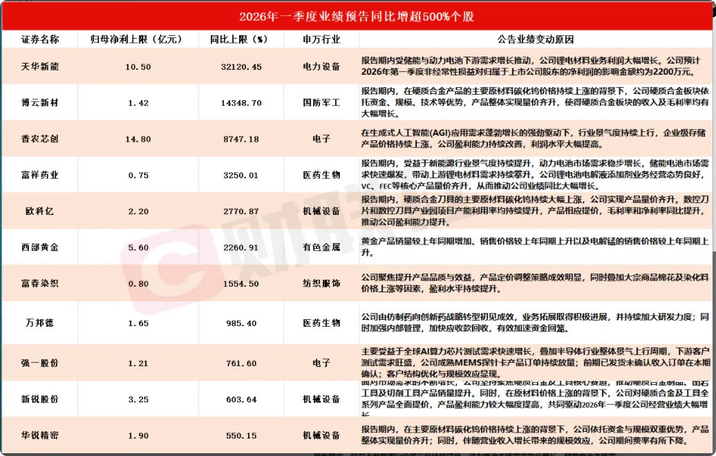 据财联社不完全统计,截至发稿,共有81家A股上市公司发布2026年一季度业绩预告。其中,11只个股净利润同比预增上限超500%,分别为天华新能、博云新材、香农芯创、富祥药业、欧科亿、西部黄金、富春染织、万邦德、强一股份、新锐股份、华锐精密(具体情况见下图)。