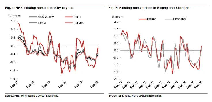 在18个主要城市中,第一季度的现有住宅销量环比降幅显著收窄,从2025年第四季度的-23.0%降至-2.1%。这一迹象表明市场开始出现稳定化的趋势。在一线城市中,上海的表现最为突出:第一季度其住宅销量实现了微幅增长。3月28日,上海的每日现有住宅成交量达到了1,585套,这是五年来最高的单日成交量。随着交易量的增加,现有住宅价格跌幅也有所缩小。2月份,全国房地产统计系统公布的现有住宅价格环比跌幅为0.43%,这是自2025年4月以来最小的跌幅。一线城市在这方面表现最为明显,北京和上海的房价都出现了上涨趋势。