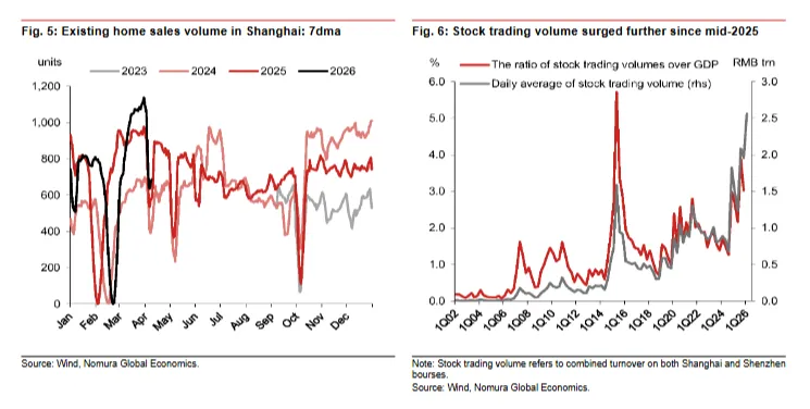 在财富效应方面,2025年7月至2026年2月期间,Wind全A指数——这一反映上海证券交易所、深圳证券交易所和北京证券交易所上市的所有A股股票整体表现的指标——上涨了30.6%。这一涨幅显然带来了相应的财富效应。据彭博社报道,股市上涨的主要推动力来自高净值人士的资金投入,而非家庭储蓄的流入。正如我们在2025年9月所预测的那样,2025年下半年股市的上涨虽然在全国范围内带来的财富效应有限,对整体经济的影响也不大,但它确实让一些富有的投资者受益匪浅。