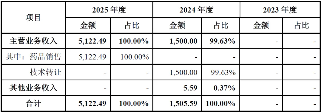 营业收入方面,2023年公司无主营业务收入;2024年实现营业收入1,505.59万元,主要为技术转让收入;2025年实现营业收入5,122.49万元,全部为药品销售收入,随着核心产品的上市销售,公司营业收入实现了突破性增长。