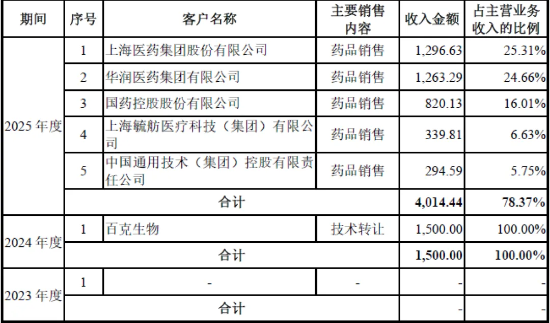 报告期内,公司的客户结构随着业务发展逐步发生变化。2023年,公司无主营业务收入;2024年,公司主营业务收入均来自百克生物的专利技术转让收入;2025年,随着核心产品斯泰度塔单抗注射液获批上市并开始销售,公司客户转变为医药流通企业及终端医疗机构。2025年度,公司主营业务前五名客户分别为上海医药集团股份有限公司、华润医药集团有限公司、国药控股股份有限公司、上海毓舫医疗科技(集团)有限公司、中国通用技术(集团)控股有限责任公司,合计销售收入为4,014.44万元,占主营业务收入的比例为78.37%。