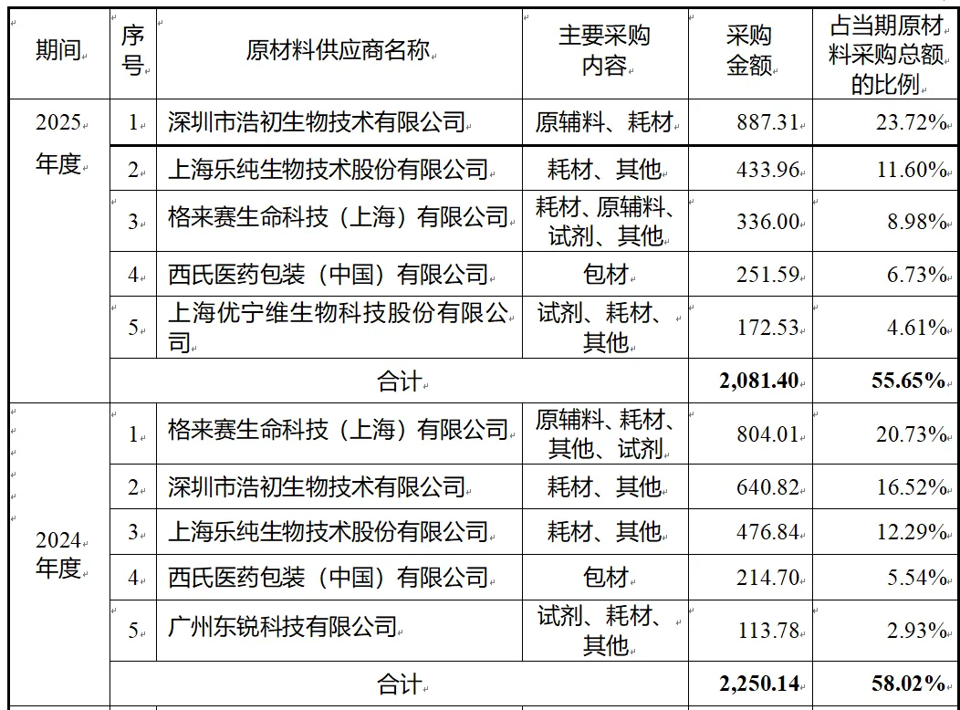 公司的原材料主要包括培养基、细胞补料、填料、注射剂瓶、胶塞等生产环节所需耗材、原辅料、试剂及包材等。报告期内,公司的重要原材料供应商主要包括深圳市浩初生物技术有限公司、上海乐纯生物技术股份有限公司、格来赛生命科技(上海)有限公司等。