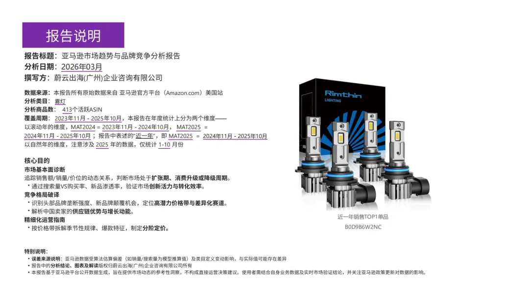 报告基于亚马逊美国站 2023 年 11 月 - 2025 年 10 月 413 个活跃 ASIN 数据,全面分析雾灯品类市场规模、竞争格局、价格趋势与运营机会,为跨境商家提供决策参考。