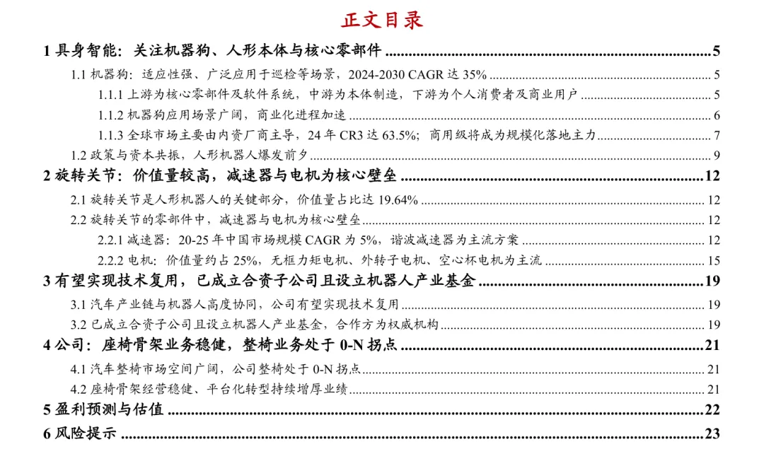 摘要:上海沿浦深耕汽车冲压与焊接零部件,依托汽车与机器人技术同源优势,实现制造能力复用,汽车电驱动、减速器等核心技术可直接适配机器人领域需求。公司加速布局具身智能赛道,出资51%成立合资子公司锡纳泰克,与上海机器人产业技术研究院合作,承接关节模组规模化生产,首条自动化产线即将落地,同时参与设立2000万元机器人产业基金,已完成机器人关键部件第一阶段技术储备。本报告梳理公司布局,研判具身智能行业机遇,为投资者、零部件行业从业者提供决策参考。