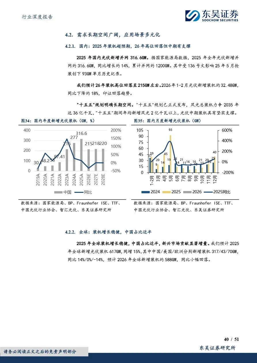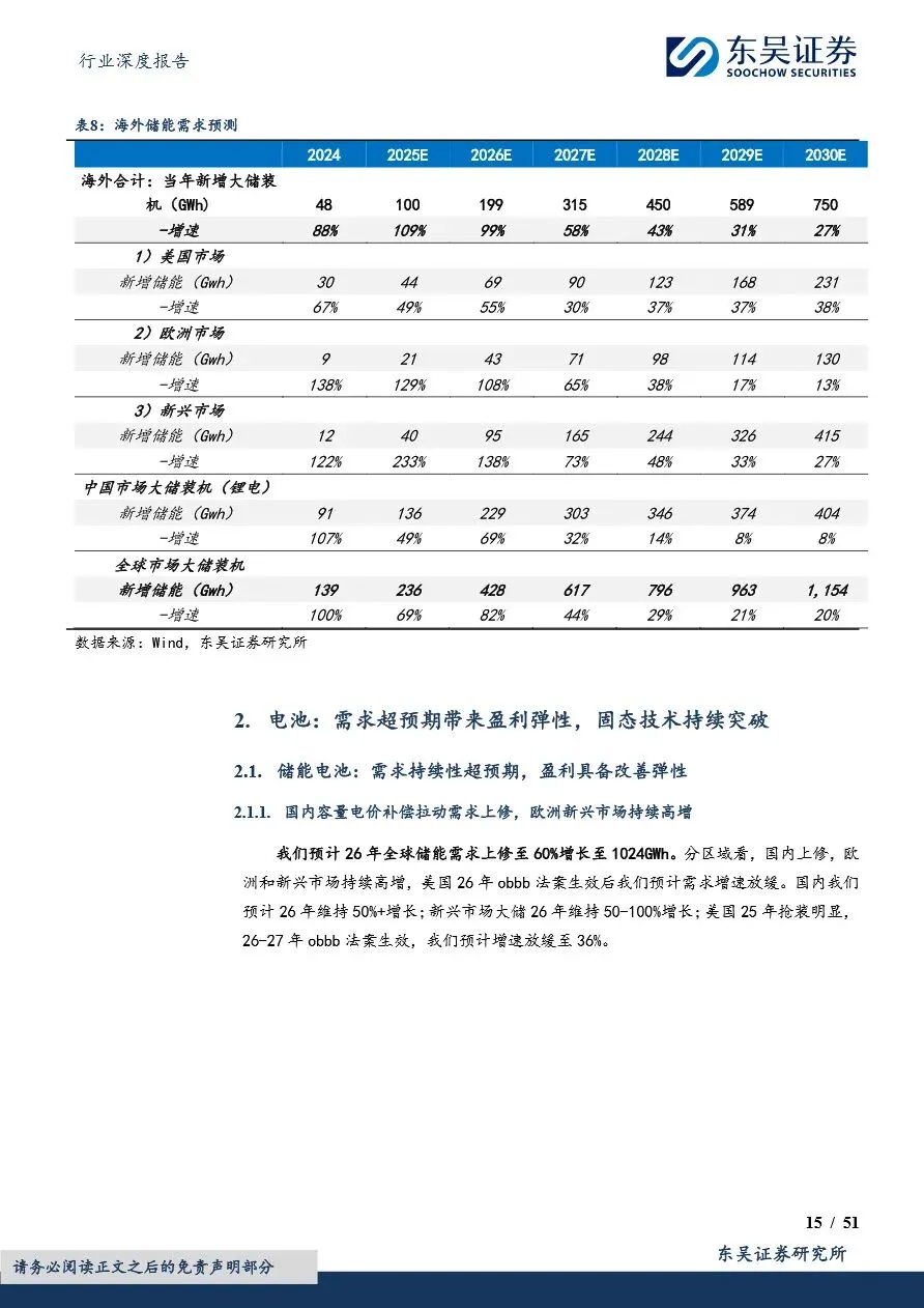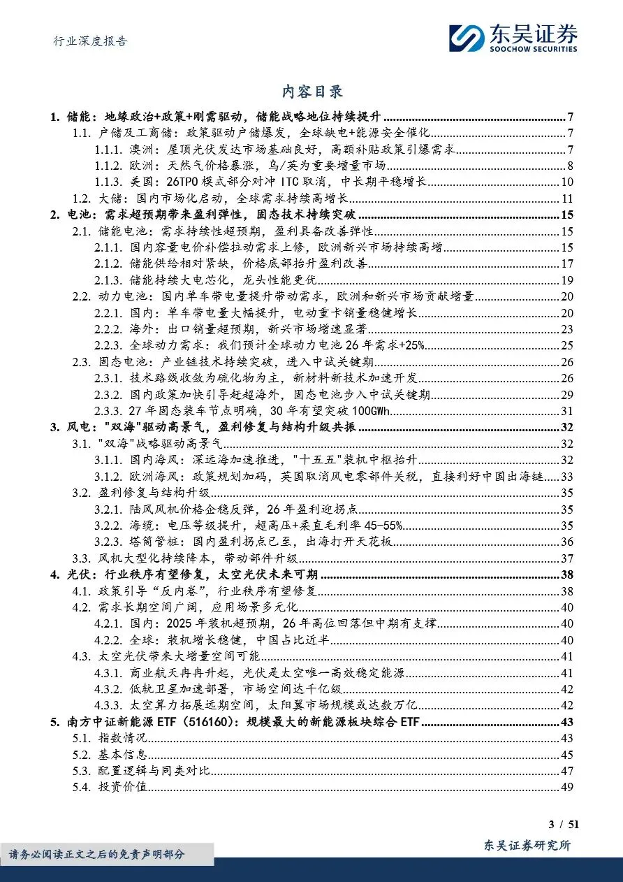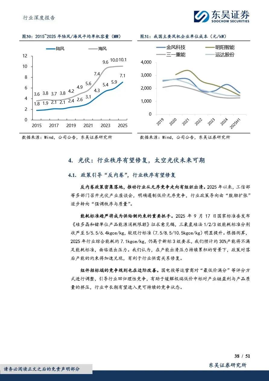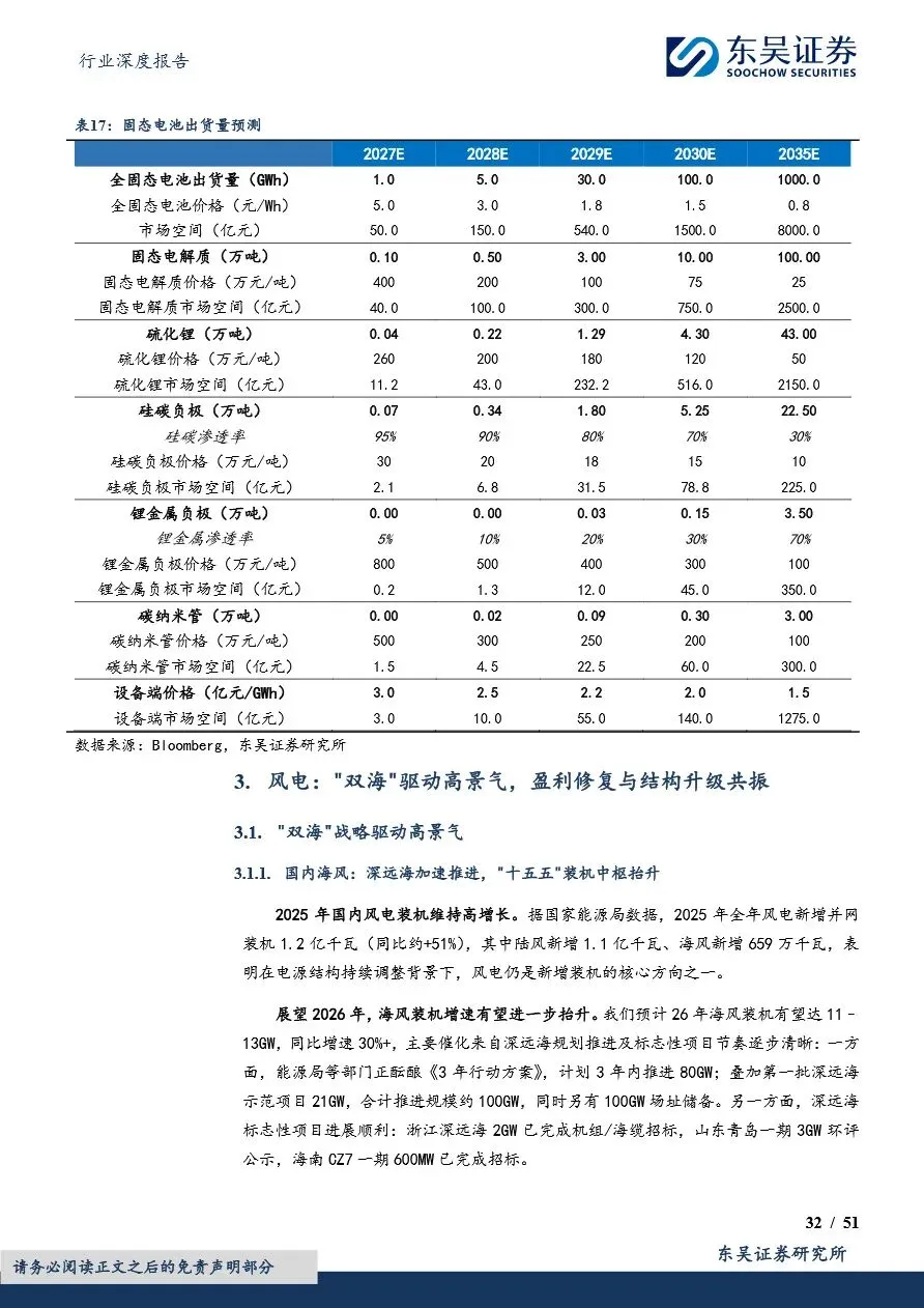 电力设备行业的技术创新与市场布局正深刻改变着行业竞争格局。固态电池作为未来电池技术的重要方向,凭借其高安全性和高能量密度优势,正加速技术突破与产业化进程,国内外多家企业已布局硫化物等主流技术路线,预计2027年将实现小批量量产。同时,风电领域的大型化趋势显著,风机价格企稳反弹,盈利迎来拐点,海缆、塔筒管桩等关键部件也迎来结构升级与毛利改善。此外,光伏行业在政策引导下逐步修复行业秩序,太空光伏等新兴应用场景的拓展为行业带来新的增长空间。在此背景下,电力设备企业需紧跟技术发展趋势,优化市场布局,以在激烈的市场竞争中占据有利地位。