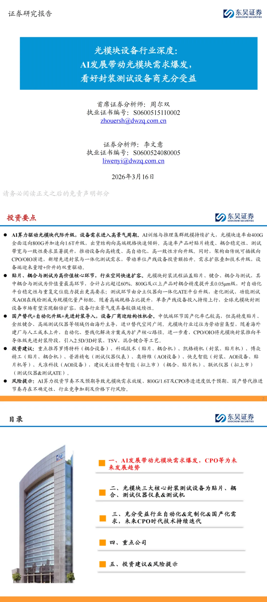 AI算力驱动光模块代际升级,设备需求进入高景气周期。AI训练与推理集群规模持续扩大,光模块速率由400G全面迈向800G并加速向1.6T升级,出货结构向高端规格快速倾斜。高速率产品对贴片精度、耦合稳定性、测试带宽与一致性要求显著提升,推动设备向高精度、高自动化、高一致性方向升级。同时,架构由传统可插拔向CPO/OIO演进,新增先进封装与一体化测试需求,带动单位产线设备投资额抬升。需求扩张叠加技术升级,设备端迎来量增+价升的双重驱动。