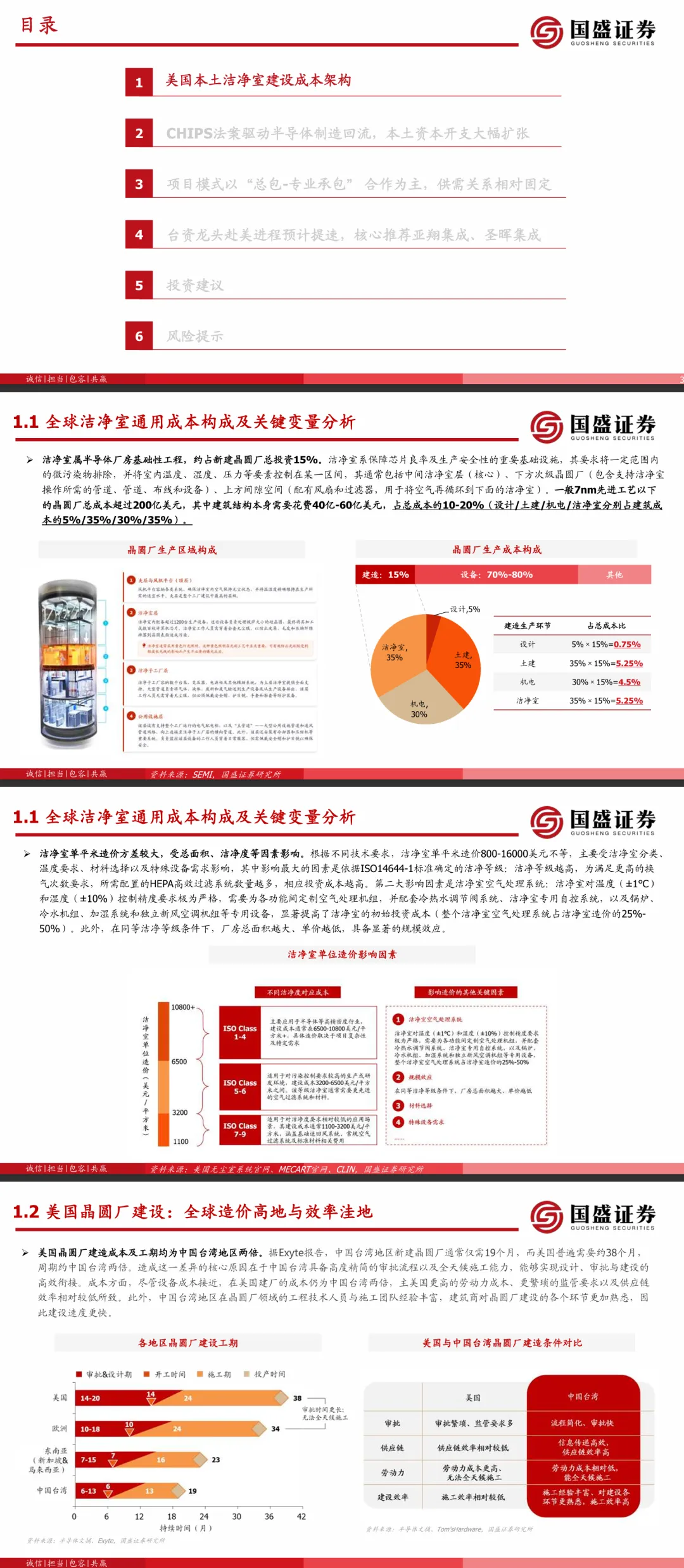 摘要:CHIPS法案推动美国半导体制造回流,本土晶圆厂规划总投资达4854亿美元,2026-2030年洁净室年均需求约74亿美元。美国洁净室建设成本与工期约为中国台湾两倍,采用“总包+专业分包”模式,竞争格局稳定。台积电引入汉唐集成承建美国项目,带动台资洁净室企业加速出海。台企凭借先进制程经验与客户资源优势,有望抢占美国市场份额,重点推荐亚翔集成、圣晖集成,关注美埃科技。本报告测算需求、解析格局、挖掘投资机会,为半导体工程行业提供参考。