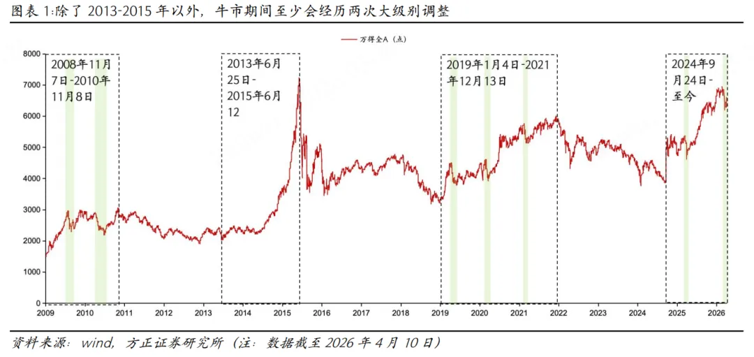 除了2013-2015年,历次牛市期间市场至少会经历两次大级别的调整。2009年以来,A股共经历四轮牛市,除了2013-2015年没有大级别的调整,其余三轮牛市市场均会经历至少两轮较大级别的调整,即万得全A指数阶段性回撤10%以上。2009年8月和2010年4月市场先后经历了两次20%以上的调整,调整幅度分别达-22.6%和-24.8%;2019-2021牛市期间,市场先后经历了三次调整,幅度分别为-15.9%、-11.0%、-10.9%;2024年“924”以来,市场于2025年3月和2026年3月经历两次调整,幅度分别达-13.8%、-10.2%。