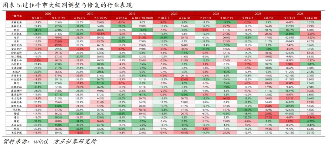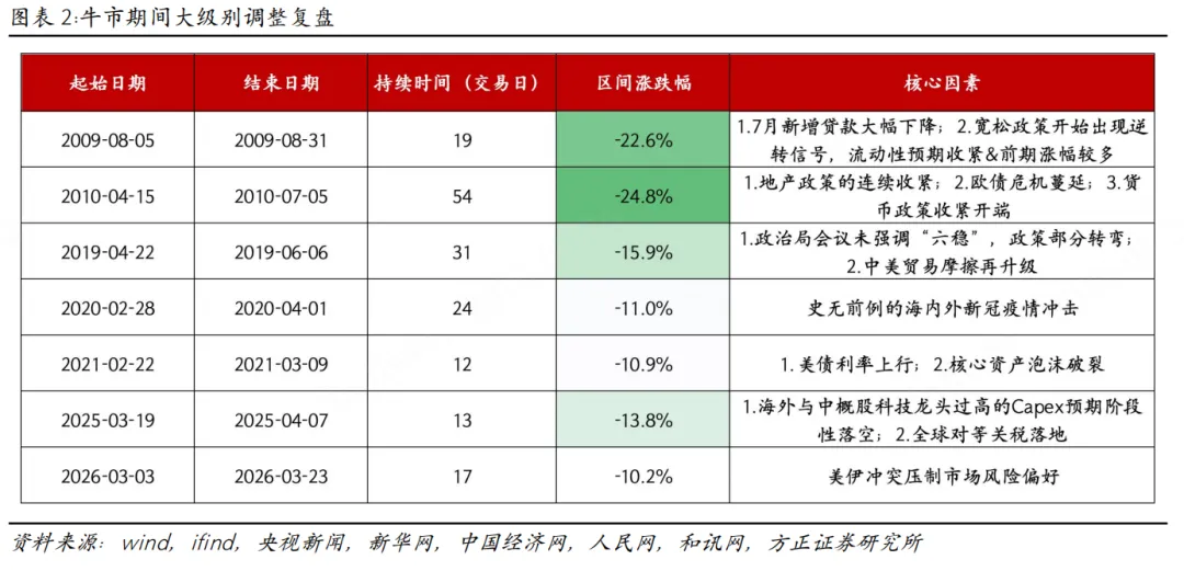 从牛市大级别调整来看,按照跌幅程度,大致可以分为三类:1)20%以上水平的调整——2009-2010年两次调整时期;2)15%左右的回撤——2019年&2025年;3)10%左右的温和回撤——2020年&2021年。