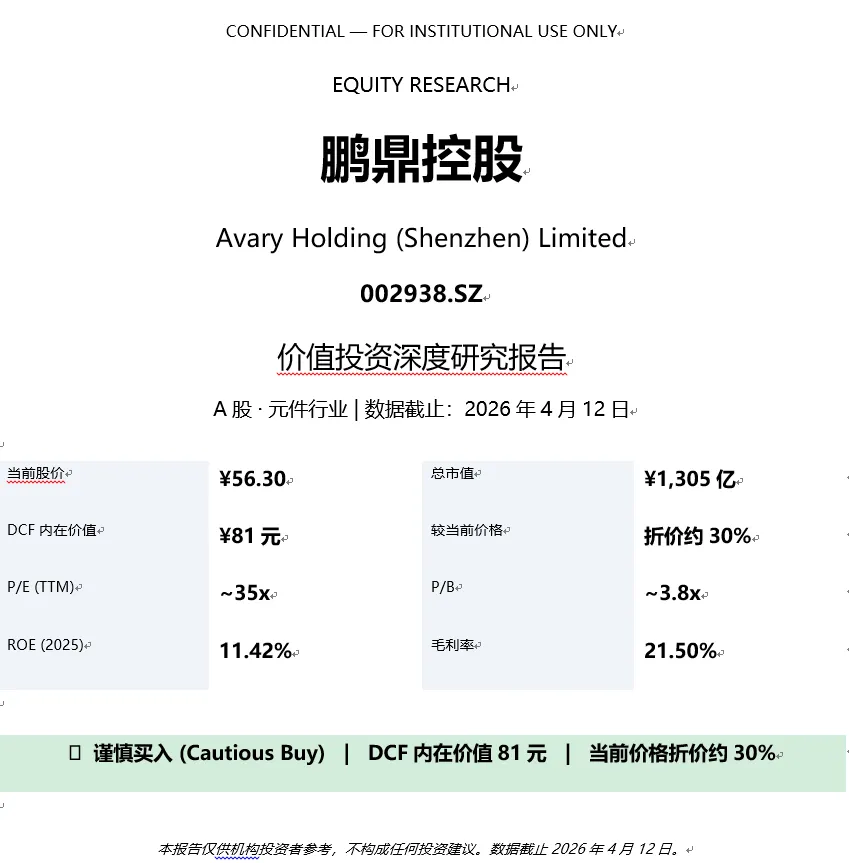 鹏鼎控股是全球第二大、中国大陆第一大PCB制造商,核心客户为苹果、三星、华为。当前股价56.30元,PE约35倍。基于年报真实数据 +券商盈利预测(2026-04-08),DCF三阶段模型估算内在价值约81元,当前价格较内在价值折价约30%,存在安全边际。2026年4月8日股价放量突破52周新高,技术面强势。