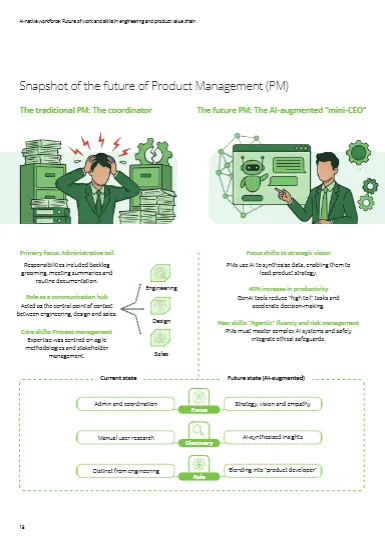 传统产品经理大量时间被事务性工作占据,整理需求、写文档、开会协调、跟进进度,更像一个沟通枢纽。AI把这些高耗力、低价值的工作全部承担后,产品经理的效率大幅提升,新产品研发周期甚至能缩短一半,角色也从协调者变成具备战略能力的“迷你CEO”。他们可以用AI快速合成用户研究结论、生成产品方案、辅助数据决策,把真正的精力放在产品方向、用户价值、战略规划、风险与合规把控上。
