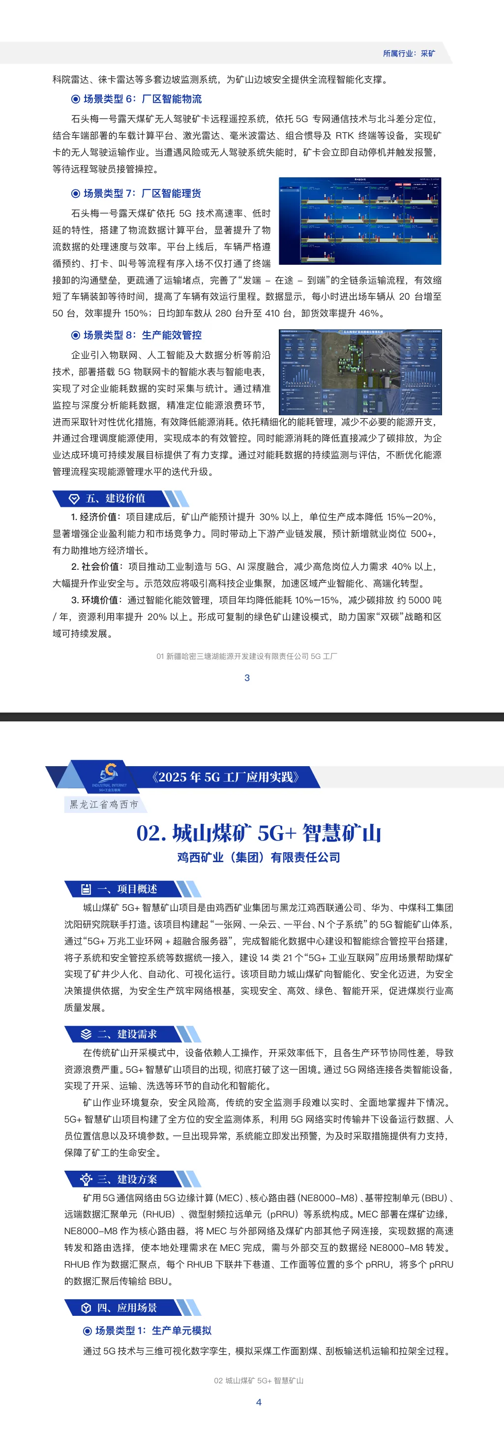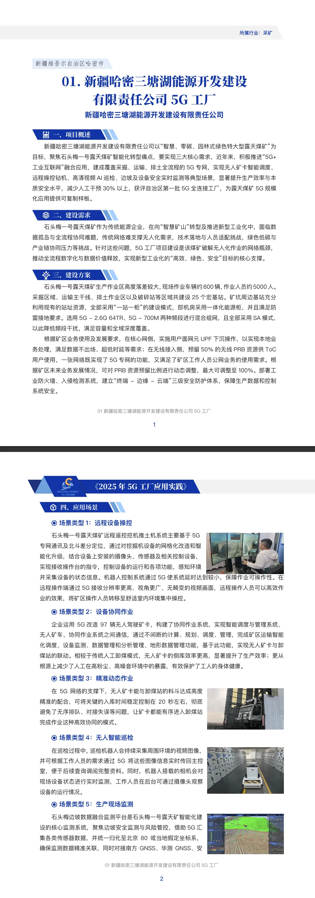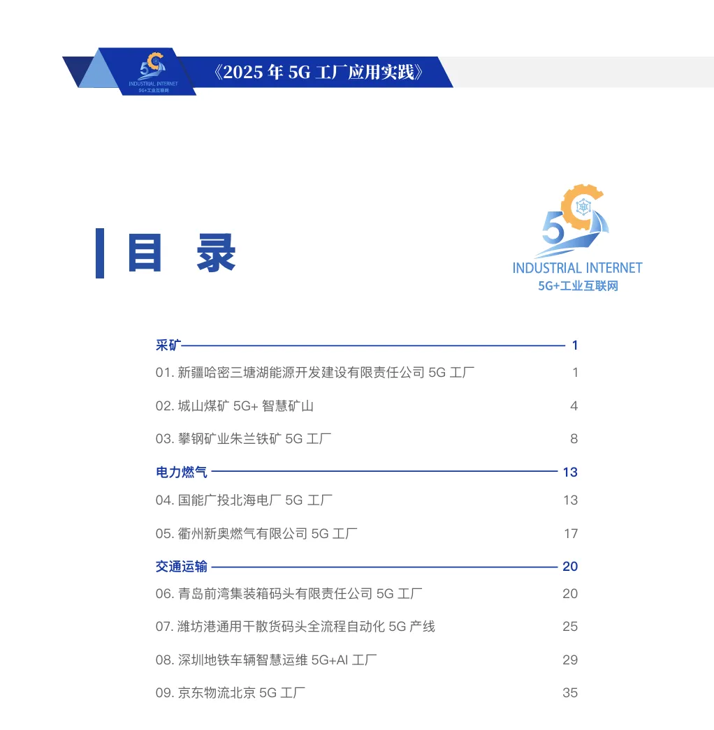 摘要:本报告聚焦能源交通领域,收录采矿、电力燃气、港口、轨道交通、物流五大行业9个5G工厂标杆案例,覆盖无人矿卡、远程操控、AI巡检、数字孪生、智能调度、设备协同、预测维护、能效管控等核心场景。通过5G专网、边缘计算与“端-边-云”架构,实现高危场景少人化、作业流程自动化、生产调度智能化,普遍实现效率提升20%-50%、成本下降15%-30%、安全风险大幅降低,为能源交通行业数字化、智能化、绿色化转型提供可复制路径。