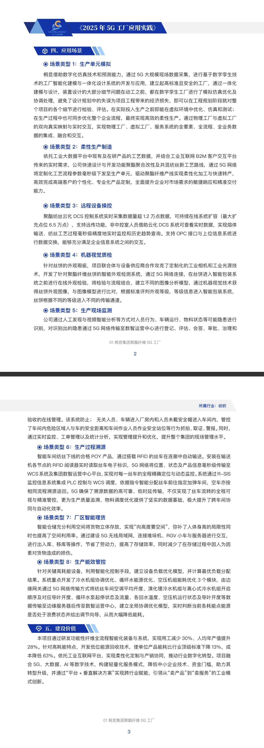 摘要:本报告由工信部发布,聚焦消费品工业,收录纺织、家电、家居、食品、医药、轻工、印刷包装七大领域24个5G工厂标杆案例,覆盖数字孪生、柔性制造、机器视觉、AGV智能物流、远程操控、预测维护、质量溯源、能效管控等核心场景。通过“端-边-云”架构与5G专网实现设备全联网、数据全贯通、生产全智能,普遍实现生产效率提升20%-50%、成本下降15%-30%、能耗降低10%-22%,为消费品制造业数字化转型提供可复制、可推广的标准化路径与实践参考。