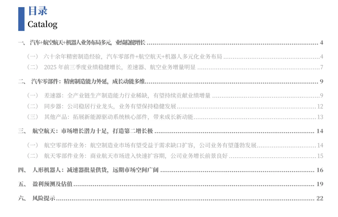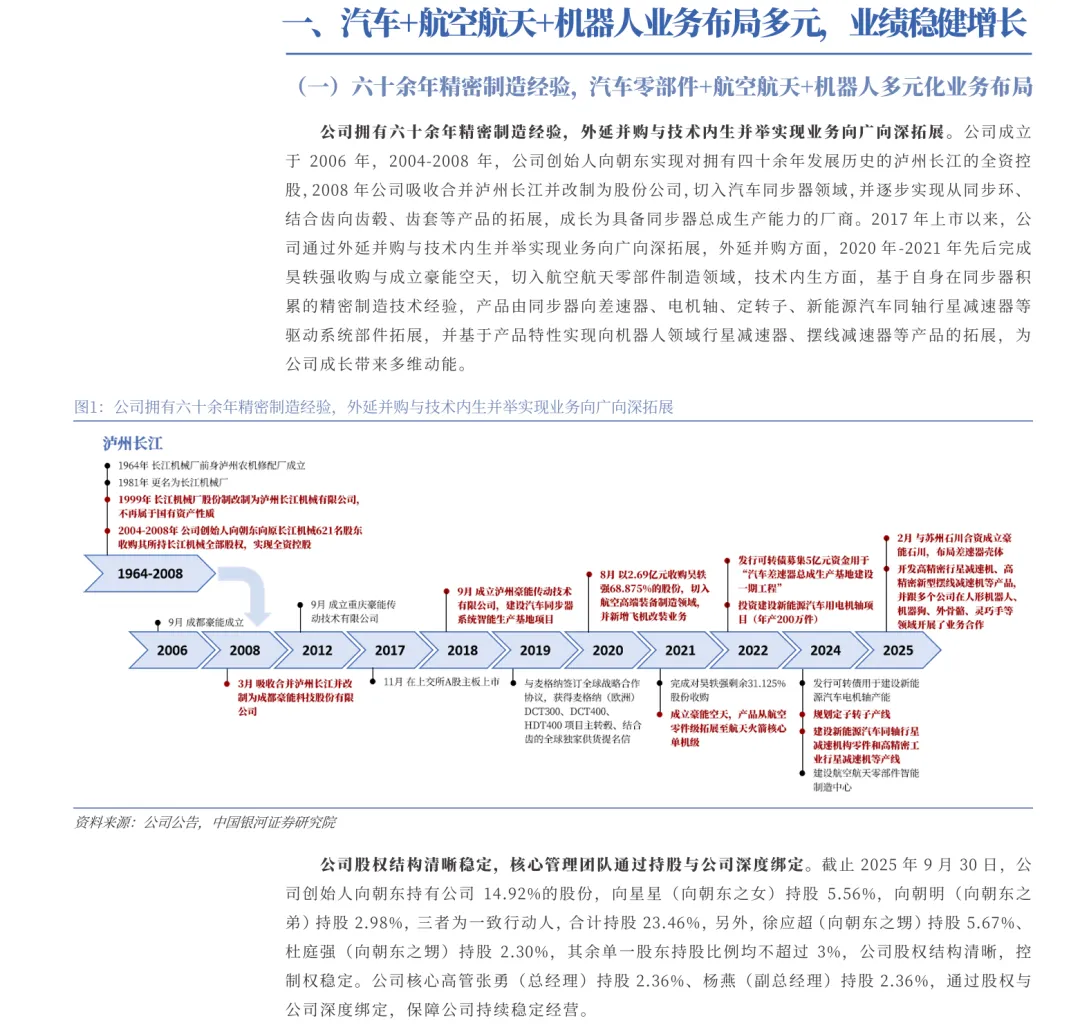 摘要:豪能股份依托六十余年精密制造能力,构建汽车、航空航天、人形机器人三维成长格局。2025年前三季度营收18.95亿元(+12.3%),扣非净利润2.52亿元(+8.6%)。汽车端同步器市占率超30%,差速器总成快速放量;航空航天业务高增,配套火箭阀门与结构件;机器人减速器已批量供货,受益行业爆发。公司多维成长动能充足,首次覆盖给予“推荐”评级,业绩有望持续兑现。