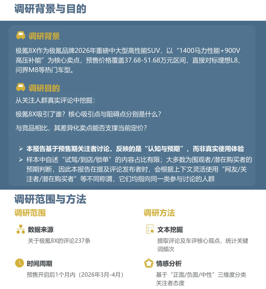 摘要:本报告基于237条真实VOC,解读极氪8X预售期用户反馈。目标用户为35-45岁增换购中产,认可1400马力、900V快充、双腔空悬、智驾硬件等高阶配置;核心顾虑为定价偏高、配置结构不合理、二排舒适性与空间不足、智驾成熟度待验证、售后与保值率存忧。用户多被性能吸引,但因性价比、家庭适配、可靠性等因素观望,部分转向理想L8、问界M8。极氪8X被定位为偏科性能车,而非全能家用车。