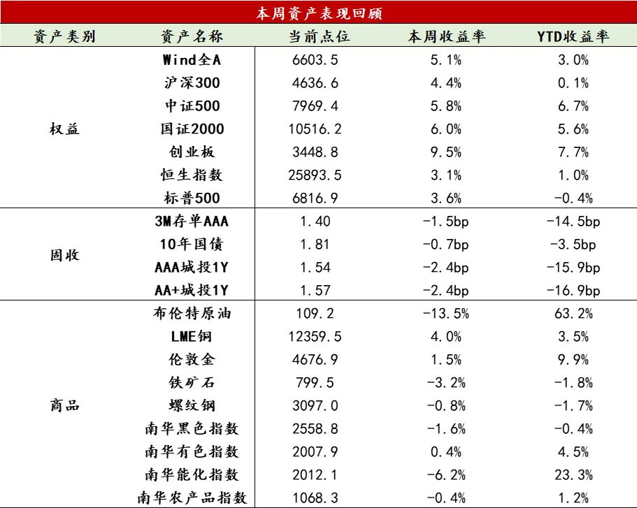 【股票】本周美股市场在地缘政治局势缓和的乐观情绪推动下全线反弹;A股同样受此影响,市场深V反转,成长风格显著占优,主要指数全线收涨,创业板指全周大涨9.5%,创下2021年12月以来新高;上证指数上涨2.74%,深证成指上涨7.16%。市场交投活跃度回升,全周日均成交额约2.13万亿元,较前一周明显放量。AI算力产业链(CPO、光模块)全线爆发,成为全周最强主线。后半周,市场焦点部分转向业绩线,券商板块在中信证券一季报超预期催化下走强,新能源板块在政策预期和5月排产新高的推动下表现同样亮眼。银行、食品饮料、煤炭板块承压。恒生指数本周上涨3.09%,恒生科技指数上涨3.87%。南向资金波动较大,全周合计净流出117.96亿港元。板块方面,工业、信息技术、可选消费涨幅居前。展望后市,中东地缘冲突出现阶段性缓和信号,是本周全球风险资产反弹的核心催化剂,但局势仍存反复可能,完全回到冲突前的概率不高。对于A股,外部风险缓释有助于提升市场风险偏好,但内部经济数据的持续性仍需观察。随着4月进入业绩密集披露期,市场定价逻辑可能逐步从地缘博弈向基本面业绩转移。策略上,建议可适当提升仓位,结构上向进攻性成长方向倾斜。可重点关注受益于全球AI产业趋势、业绩确定性强的算力硬件(CPO、光模块)板块,以及估值处于低位、业绩出现拐点的券商板块。港股科技板块虽有所反弹,但资金面仍显分歧,建议等待更明确的企稳信号后再行布局。