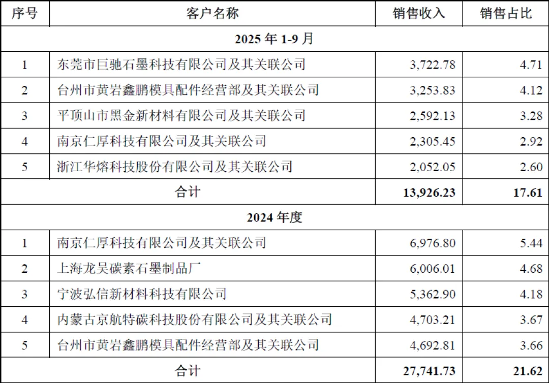 报告期内,公司客户群体稳定,主要客户包括石墨制品加工商、行业终端客户及贸易商。直接销售客户中,南京仁厚科技有限公司、内蒙古京航特碳科技股份有限公司、宁波弘信新材料科技有限公司、四川永祥光伏科技有限公司等为代表性客户;间接销售客户主要有台州茂达石墨有限公司、SEILCARBONCO.,LTD等。公司与主要客户保持长期稳定的合作关系,客户集中度合理,未出现单一客户依赖风险。