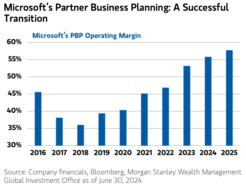 以成功转型为SaaS/云模式的公司为例,Microsoft 的合作伙伴业务规划(PBP)部门(涵盖Office及其他协作与内容应用软件)在2016财年首次开始报告云收入时,其营业利润率一度出现下滑。当时,该部门约三分之二的应用软件收入仍来自本地部署。