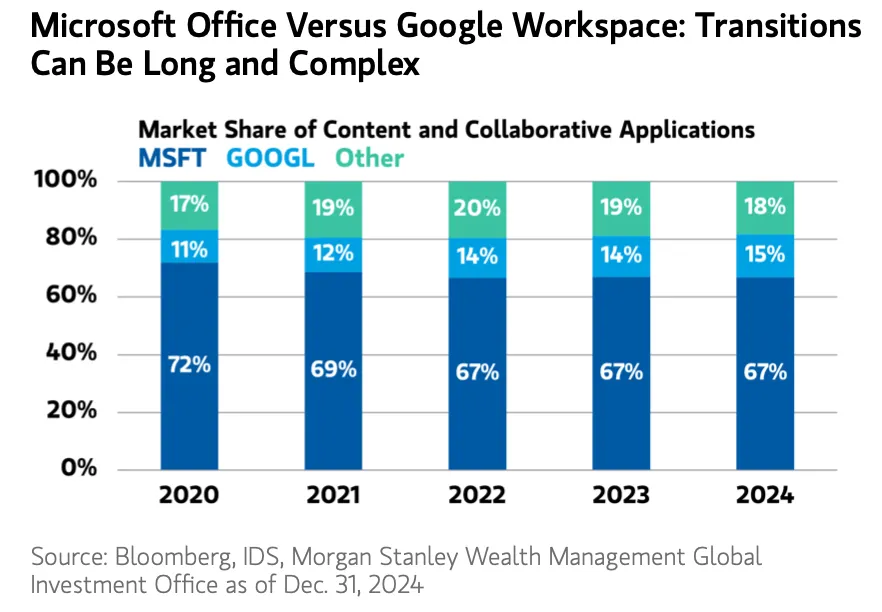 另一个典型案例是 Microsoft Office 与 Google Workspace(原Google Suite)之间的竞争。尽管Google Workspace成本更低,甚至对个人用户免费,但它始终难以打入大型企业市场,更多是在中小企业和个人用户中取得进展。其收入在2020年至2024年间接近增长三倍,但市场份额仅提高了4个百分点,达到15%。