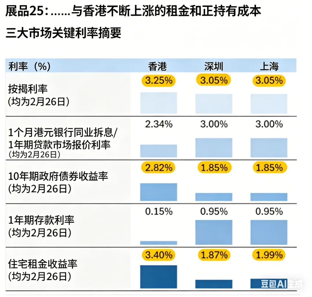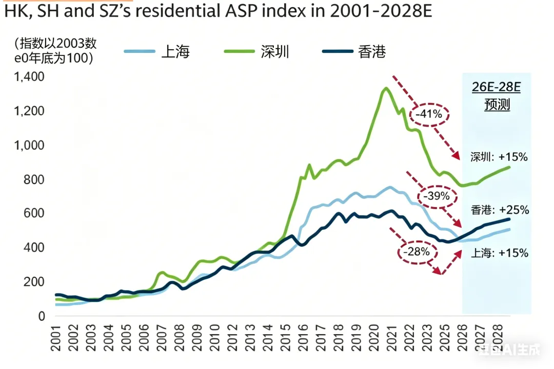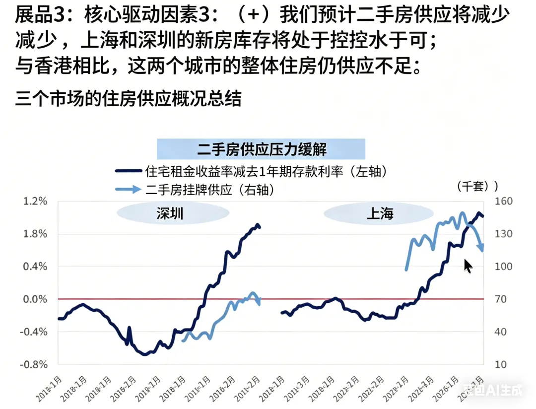 报告显示,当前上海和深圳的租金回报率大幅跑赢一年期定存利率,根据美国历史上的二手房挂牌经验,两者差值越大,即租金回报率越高于定存利率,二手房挂牌量越小,很多房东会选择持有房产,由售转租。库存方面,包含已出让未开发土地、已开发未售房源的广义库存去化周期,香港约为5年,深圳约为4年,上海约为6年,三地基本持平。狭义库存层面,深圳新房去化周期约为10个月,二手房去化周期约为14个月;上海新房去化周期约为17个月,二手房去化周期约为6个月。套户比方面,香港套户比为1.1,即房屋总量比常住家庭户数多10%,深圳套户比仅为0.6,上海为0.8,意味着两地居住需求仍未被满足。在四项逻辑之外,高盛地产团队还叠加了资本市场财富效应的支撑:香港恒生指数长期领先于香港房价走势,每次恒生指数上涨后,都会带来财富效应,当地居民金融资产增值后,资金会溢出到房地产市场,推高房价。上海和深圳分别拥有上交所和深交所,两地居民金融资产占比较高,按照同样的逻辑,若资本市场上行带来财富效应,也将有助于两地房价提前企稳回升。综合以上因素,高盛地产团队得出上海、深圳房价将在2026年四季度触底,2025-2028年累计上涨15%,报告的荐股部分提出,华润、金茂、中海、绿城等在上海、深圳拥有较多土地储备和项目储备的房企,股价将跟随房价企稳回升,复刻香港房价复苏后港资地产股上涨的逻辑——此前香港房价触底回升后,当地房企股价已经上涨65%,而当前国内房企股价累计下跌17%,具备上涨空间。需要注意的是,报告中并未给出15%涨幅的具体量化测算逻辑,该涨幅数据无明确推导过程。