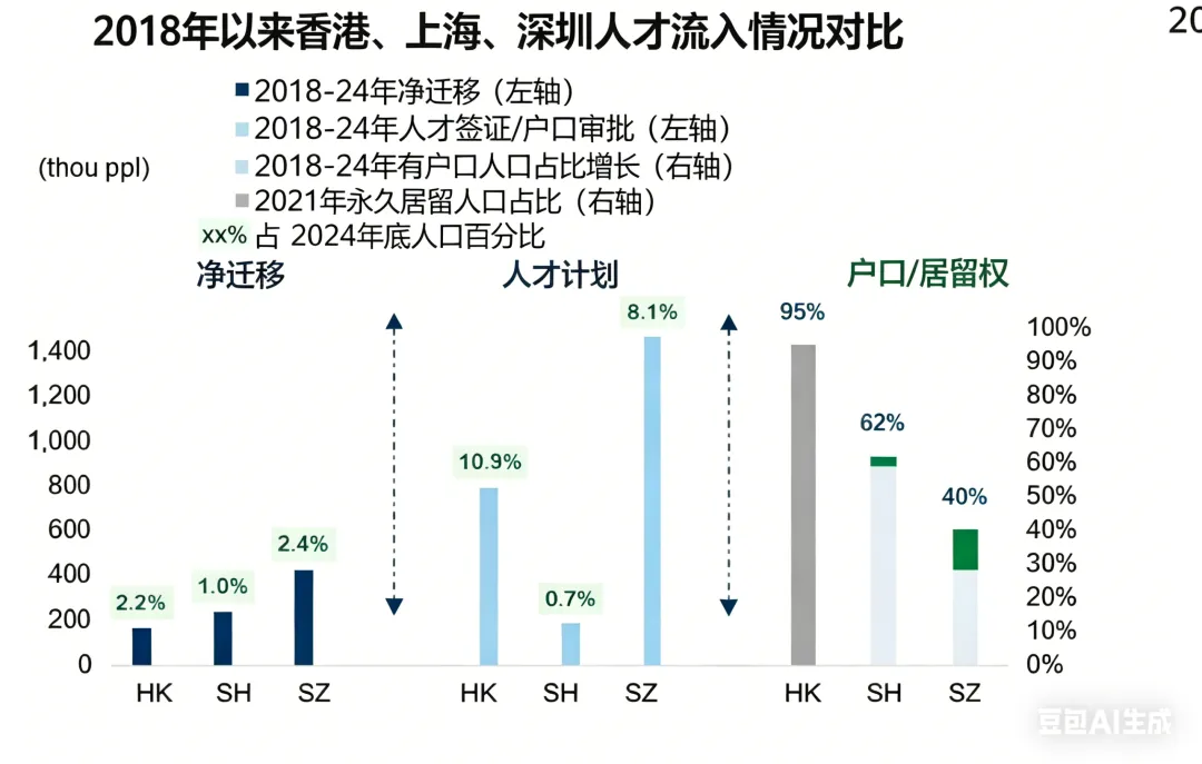 报告认为近两年上海积分落户政策放宽,有助于常住人口转为户籍人口,而户籍人口留在本地生活、买房的概率比常住人口更高。数据显示,2018-2024年期间,香港净吸纳人口16.3万人,占总人口的2.2%;上海净吸纳23.6万人,占总人口的1%;深圳净吸纳42.6万人,占总人口的2.4%。此前上海吸纳人口相对较少是因为户籍限制较严,2021年起上海积分落户总量开始提升,户籍人口总量的上升斜率明显加大,深圳户籍人口总量也在持续提升。收入层面