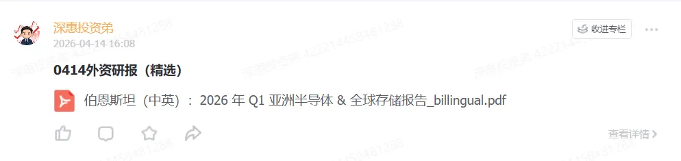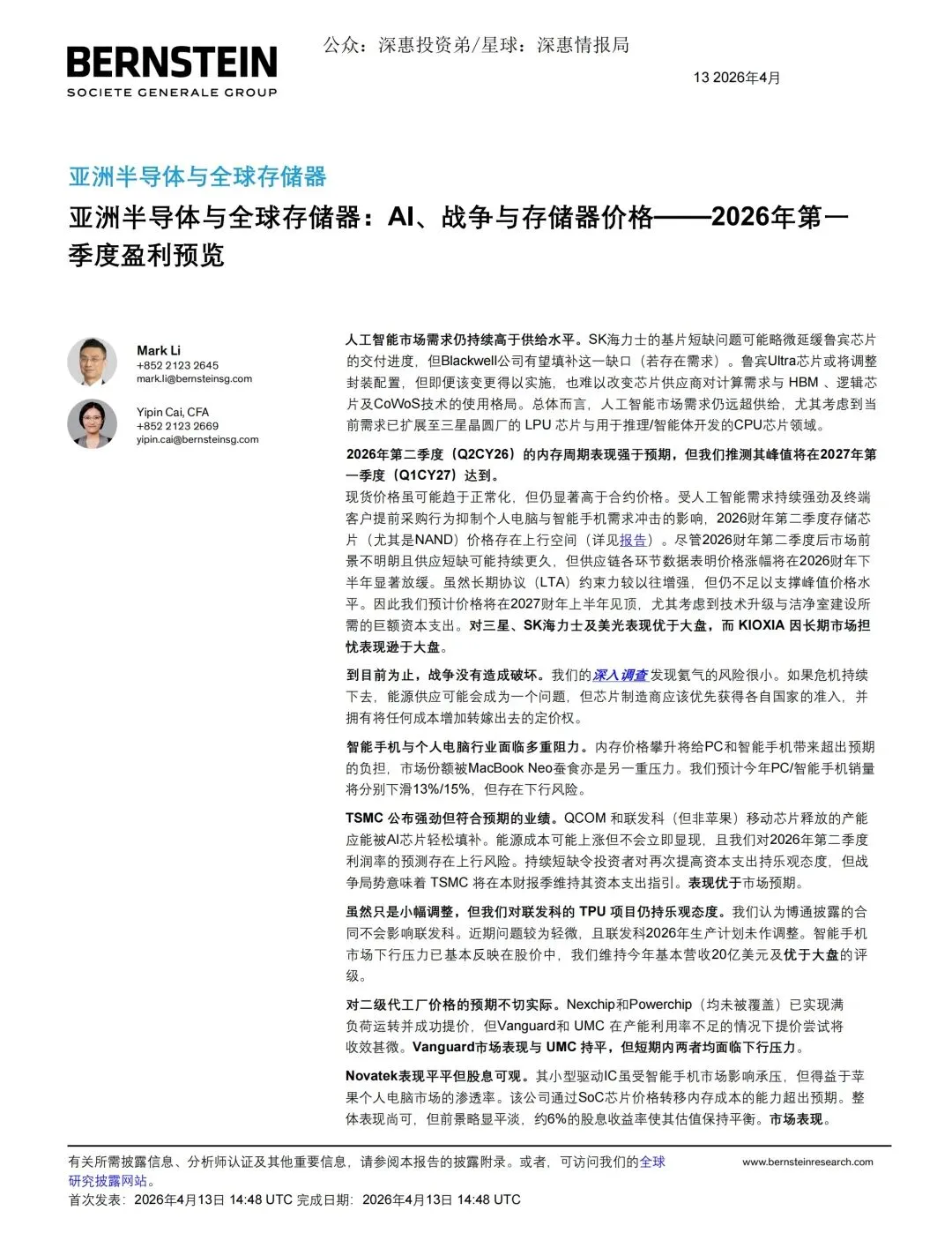 伯恩斯坦(Bernstein)2026年4月13日发布《亚洲半导体与全球存储:AI、战争与存储器价格》研报,对2026年第一季度半导体行业进行了全面分析。报告指出,AI算力需求持续高于供给水平,存储芯片市场已进入“超级牛市”阶段,价格涨幅创下近五年新高。