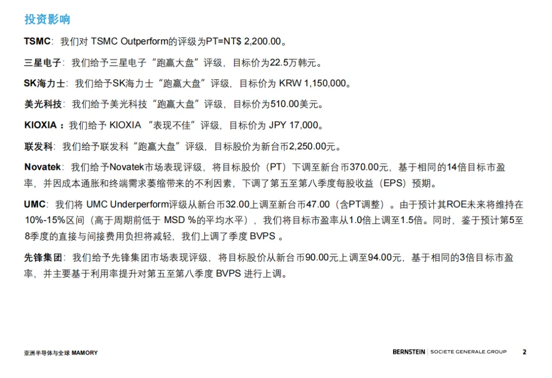 伯恩斯坦对主要半导体厂商给出了明确的投资评级。台积电、三星电子、SK海力士、美光科技和联发科均获得“跑赢大盘”评级,而KIOXIA因NAND市场存在结构性问题而被给予“跑输大盘”评级。