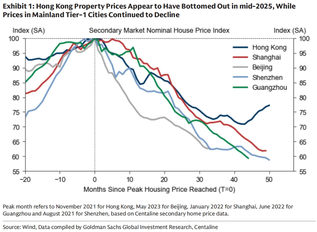 图注:高盛宏观团队这篇Asia in Focus先确认了一个现实:香港住宅价格在2025年中左右已经出现企稳迹象,但内地一线城市整体仍未走出同样清晰的底部形态。