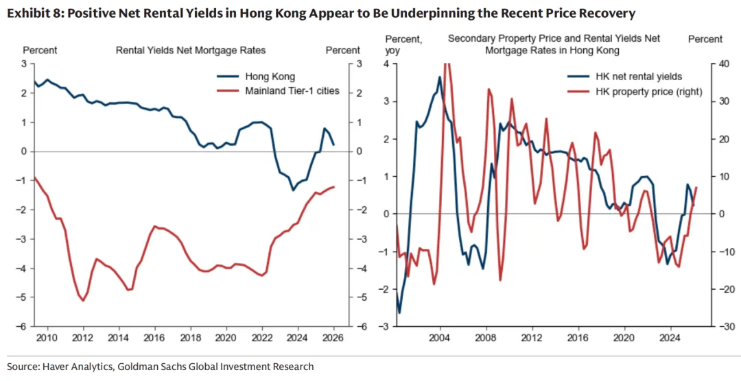 高盛特别强调了一点:香港的净租金收益率已经转正,而内地一线虽然按揭利率也在下降,但净租金收益率还是负的,而且整体水平仍低于香港。