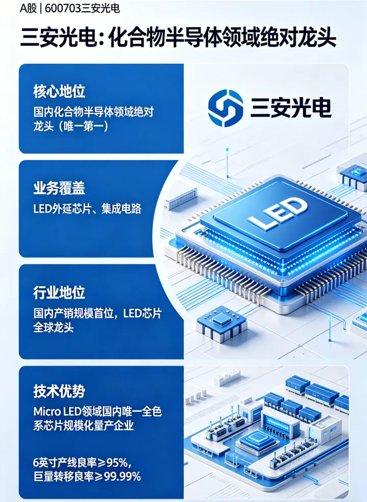 三安光电股份有限公司(A股|600703三安光电)是国内化合物半导体领域的绝对龙头。不是之一,就是第一。它覆盖了LED外延芯片和集成电路多个领域,国内产销规模位居首位,LED芯片更是全球龙头。一句话概括:在中国做化合物半导体,三安光电就是天花板。特别是Micro LED领域,它是国内唯一实现全色系芯片规模化量产的企业,6英寸产线良率达95%以上,巨量转移良率99.99%。