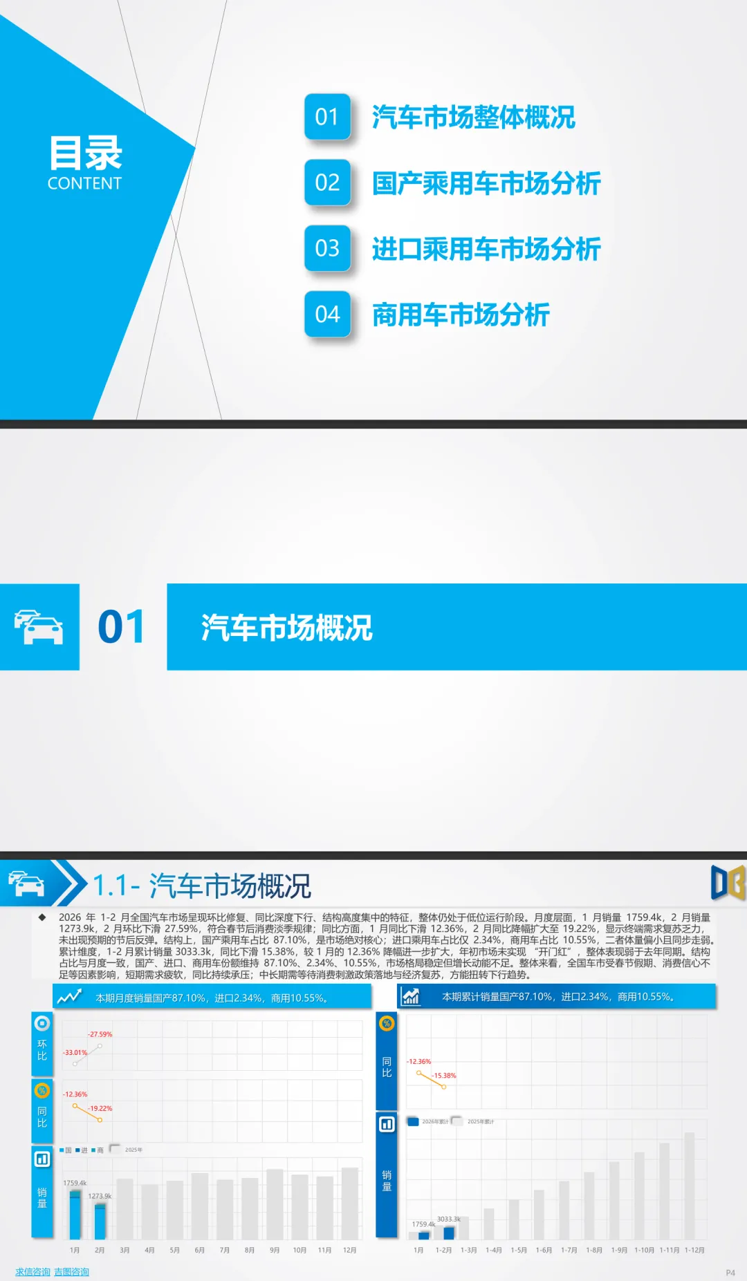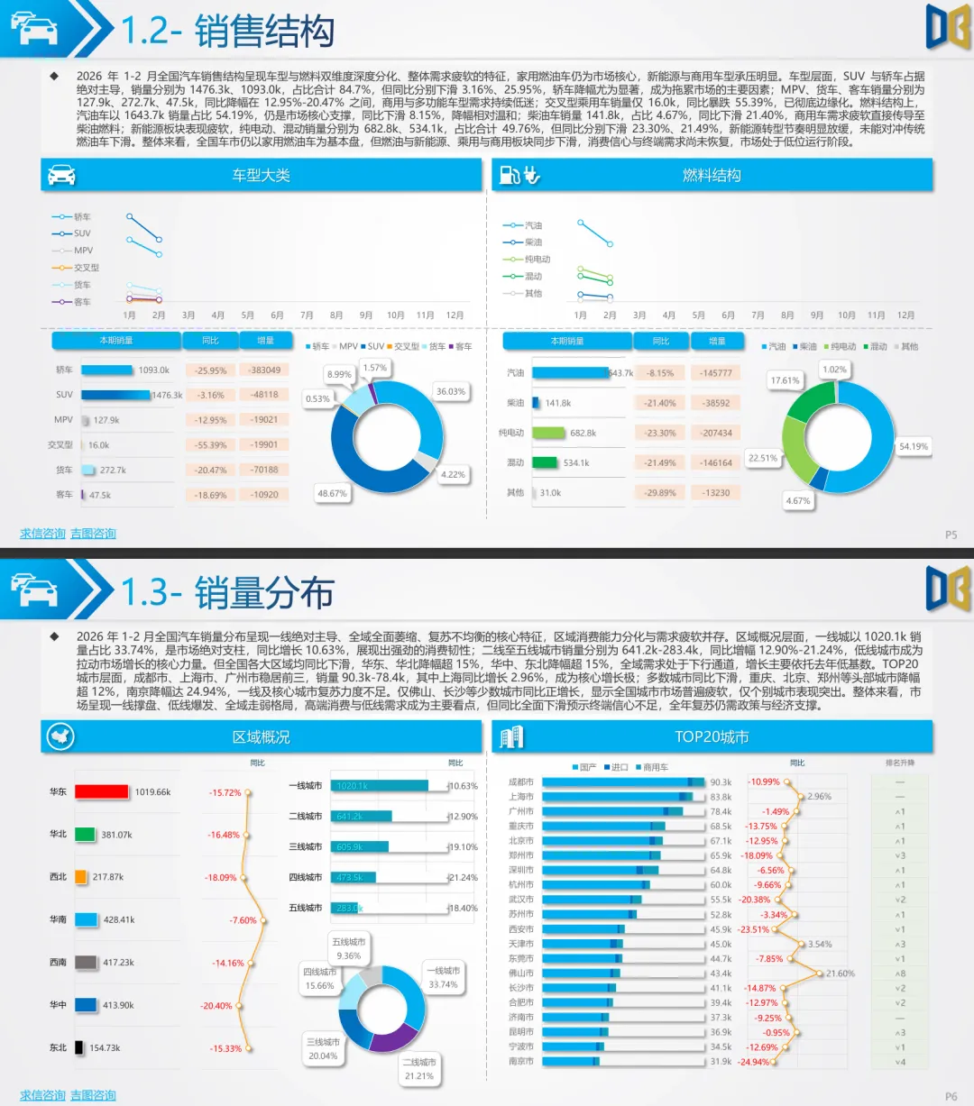 摘要:2026年1-2月全国汽车市场累计销量303.3万辆,同比下滑15.38%,整体低位运行。国产乘用车占比87.1%,同比降14.74%,合资品牌强势复苏,自主与新势力承压;SUV相对稳健,轿车大幅下滑,燃油车韧性凸显,纯电、插混同比分别降23.3%、21.49%。进口乘用车同比降15.77%,日系走强、德系豪华承压。商用车同比降20.21%,货车为主力拖累,新能源商用车逆势增长。市场呈现一线撑盘、低线走弱、燃油稳盘、新能源降温格局,复苏依赖政策与经济支撑。