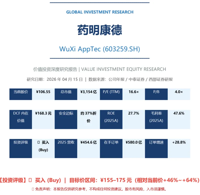 药明康德(WuXi AppTec, 603259.SH)是全球领先的CRO/CDMO"一体化端到端"药物研发生产平台。2025年公司实现营业收入454.56亿元(+15.84%),持续经营业务收入434.2亿元(+21.40%),归母净利润191.51亿元(+102.65%,含出售临床CRO子公司一次性投资收益约58亿元),扣非归母净利润132.41亿元(+32.56%),经调整Non-IFRS归母净利润149.60亿元(+41.30%)。 ▸ 订单高增:在手订单580亿元(+28.8%),创历史新高;2026年收入指引513–530亿元(+18%–22%)。 ▸ TIDES爆发:多肽/寡核苷酸CDMO业务收入113.7亿元(+96.0%),固相合成反应釜总体积>100,000L,全球规模最大。 ▸ 美国需求强劲:美国客户收入同比+34.3%至312.5亿元,海外需求持续验证,biotech融资回暖利好持续。 ▸ 估值低位:DCF内在价值约¥168元,当前P/E TTM仅16.6×(历史均值33×),折价约37%,安全边际显著。