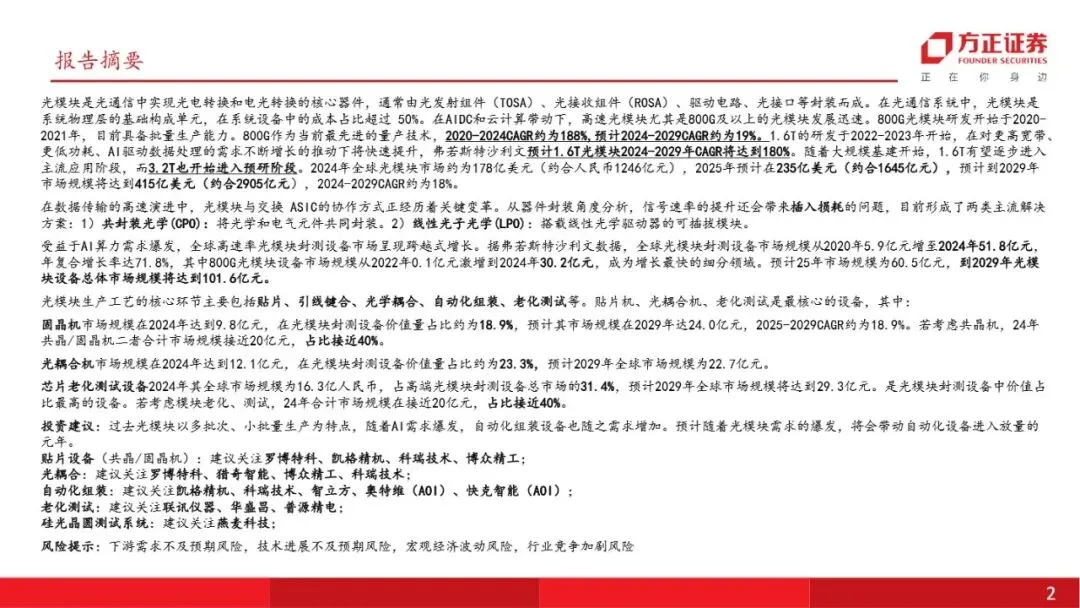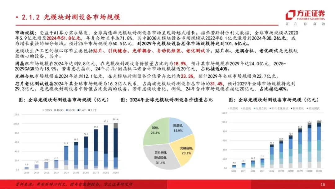 光模块作为光通信系统的核心组件,正迎来前所未有的市场需求增长期。随着AIDC和云计算的快速发展,高速光模块尤其是800G及以上速率的光模块需求激增,成为市场增长的主要驱动力。据预测,全球光模块市场规模将从2024年的178亿美元增长至2029年的415亿美元,年复合增长率达18%。这一趋势不仅推动了光模块技术的快速迭代,也带动了光模块封测设备市场的跨越式增长,预计到2029年,光模块设备总体市场规模将达到101.6亿元。光模块的生产工艺复杂,涉及贴片、引线键合、光学耦合、自动化组装及老化测试等多个核心环节,每个环节都需要高精度的专用设备支持,为设备制造商提供了广阔的发展空间。