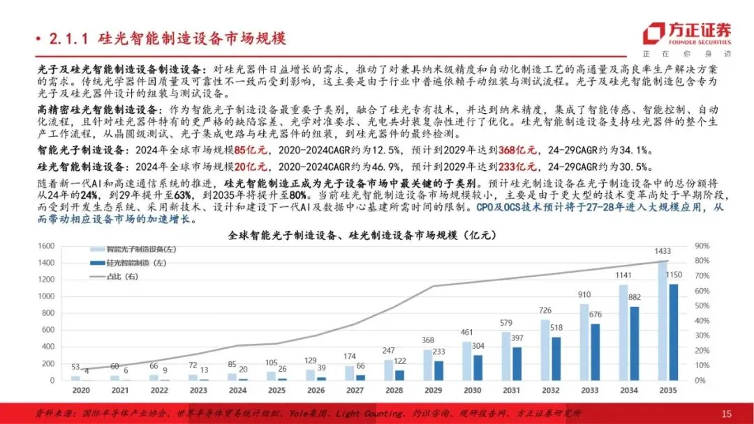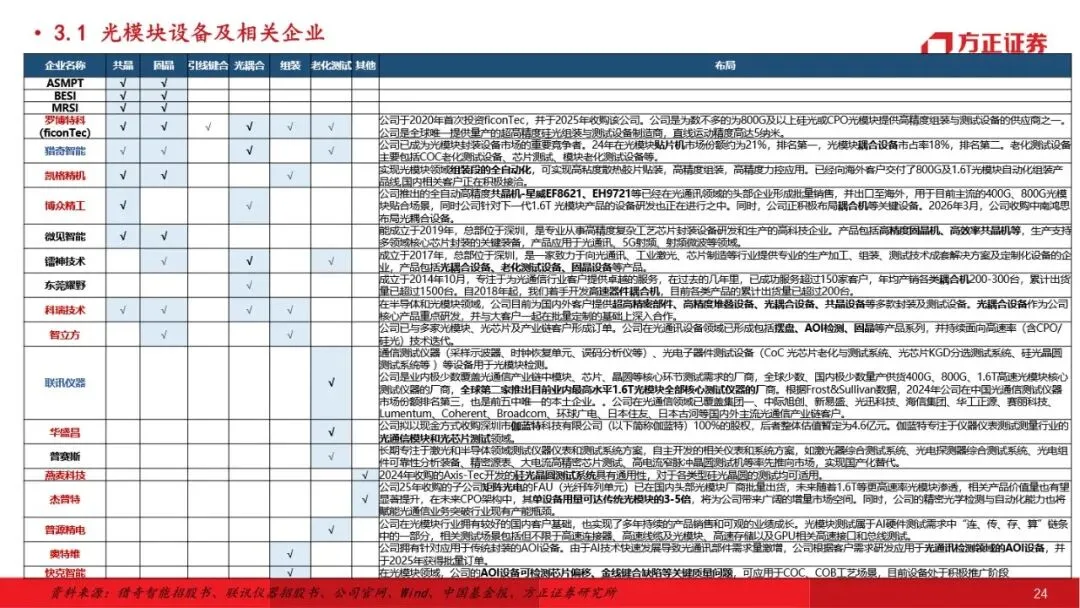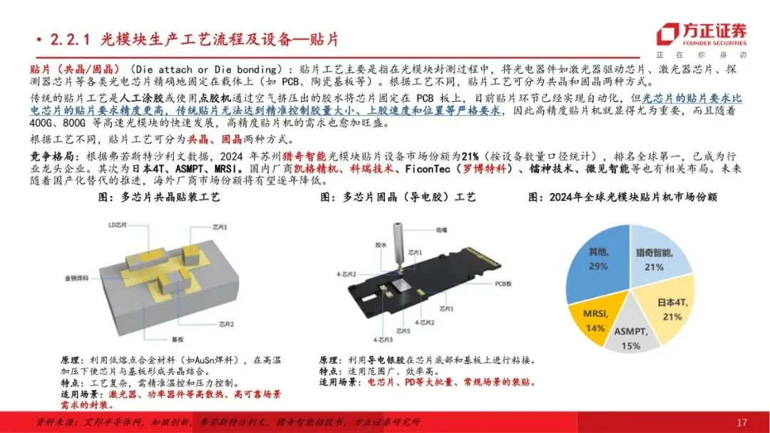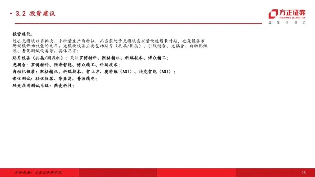在光模块设备市场中,贴片设备、光耦合机及老化测试设备是价值占比最高的核心设备。其中,固晶机市场规模预计将从2024年的9.8亿元增长至2029年的24.0亿元,光耦合机市场规模同期也将从12.1亿元增长至22.7亿元,而芯片老化测试设备市场规模更是将达到29.3亿元,显示出强劲的增长势头。随着光模块向高速化、集成化方向发展,共封装光学(CPO)和线性光子光学(LPO)等新技术不断涌现,对设备精度和性能提出了更高要求。国内设备制造商如罗博特科、凯格精机、猎奇智能等凭借技术创新和性价比优势,在全球市场中占据了一席之地,并通过不断拓展产品线和服务领域,逐步向高端市场渗透。同时,随着硅光技术的兴起,硅光晶圆测试系统等新兴设备市场也展现出巨大潜力,为行业带来了新的增长点。