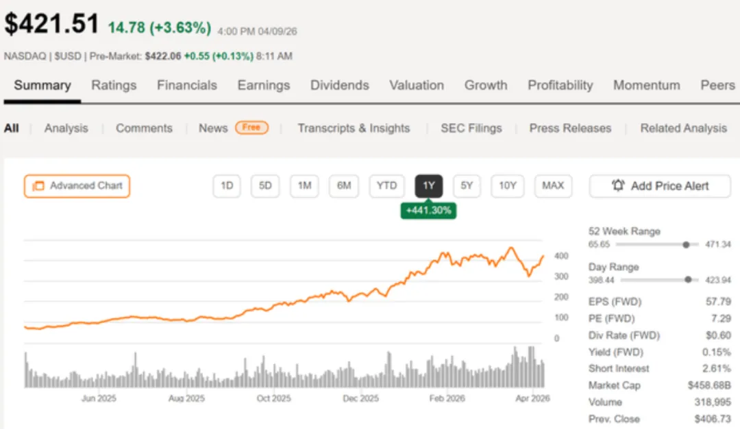 - 估值空间:在 420 美元附近,美光对应 2026 财年盈余的市盈率仅为 7 倍。基准目标价看至 425-430 美元,若供应瓶颈持续到 2026 年,仍有进一步上行空间。