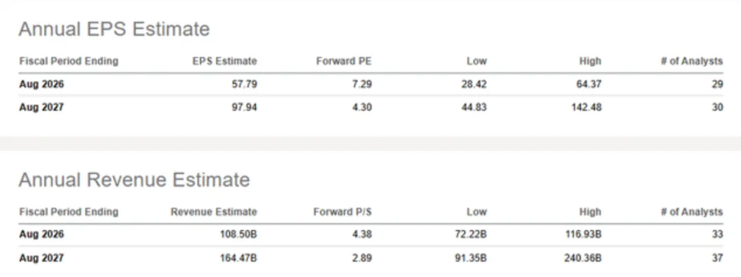 美光近期股价跌至 377 美元后迅速反弹回 420 美元,这更多是仓位博弈而非基本面变化。一致预期正在大幅上调:2026 和 2027 财年的 EPS 预计将分别趋向 50 多美元和 100 美元。这意味着这是一个结构性的台阶式飞跃,而非普通的周期性复苏。由于利润将在 2027 年之后开始正常化,前瞻市盈率将在短期内迅速压缩。美光目前的交易价格约等于 2026 财年收益的 7 倍,2027 财年的 4-5 倍。目前的 420 美元已经计入了强劲的盈利动能,但尚未完成全面的价值重估。基准目标价设定在 425-430 美元。这一预期假设公司将维持现有叙事,让盈利预期逐步赶上股价。而要冲上 440-460 美元,则需要市场更坚定地相信供应受限的状态将一直延续到 2026 年。尽管存储业务本质上仍具周期性,但目前的 AI 强化周期显著延长了这一过程。目前美光的基本面极其出色,股价正从快速复苏阶段进入需要“持续证明自己”的阶段。