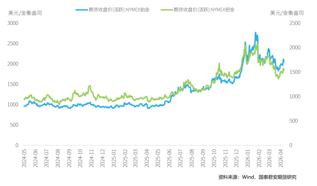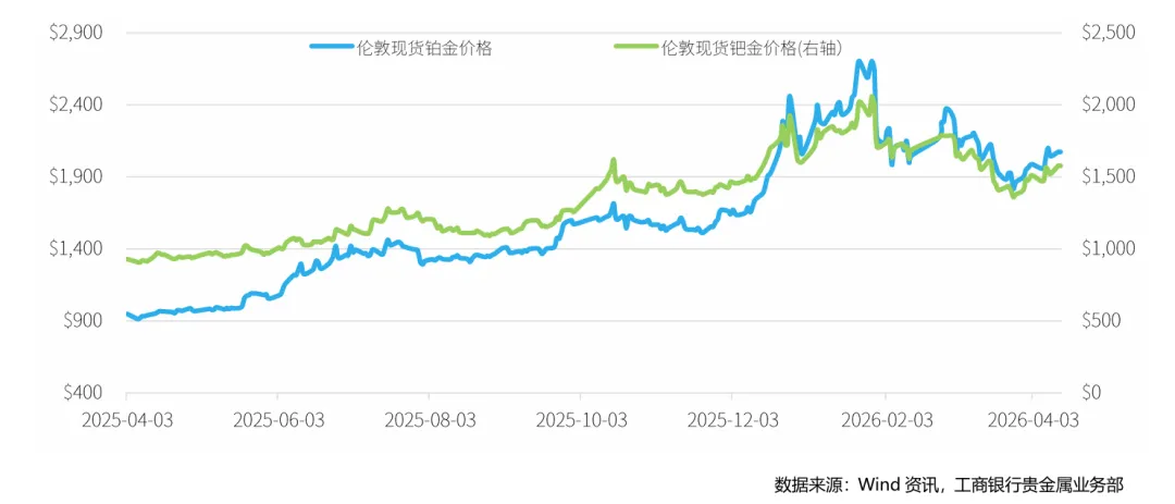 本周,铂金期货价格小幅上涨,截至2026年4月10日,NYMEX铂金期货价格收盘价为2055.3美元/盎司,周累计上涨2.77%。钯金方面,本周NYMEX钯金期货同样上涨,周五收盘价为1538美元/盎司,周上涨1.52%。