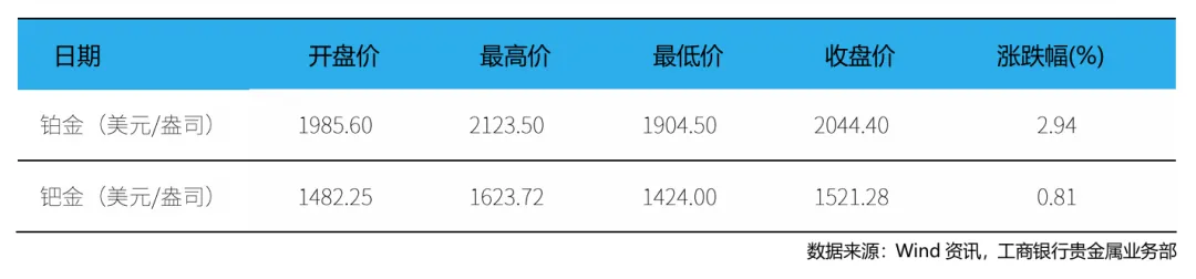 本周(4月6日 – 4月12日,下同),现货铂金开盘价为1985.6美元/盎司,最高价为2123.5美元/盎司,最低价为1904.5美元/盎司,收盘价为2044.4美元/盎司,周累计上涨2.94%。现货钯金开盘价为1482.25美元/盎司,最高价为1623.72美元/盎司,最低价为1424美元/盎司,收盘价为1521.28美元/盎司,周累计上涨0.81%。