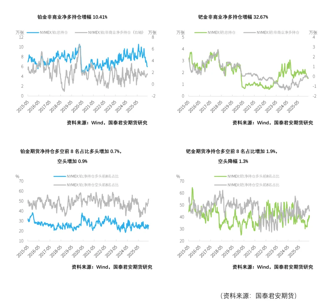 截至2026年4月7日,铂金总持仓较上周减少631张,其中非商业多头方面增加956张,非商业空头持仓较上周减少745张,降幅7.48%。因此,非商业净多头持仓增加1701张,增幅10.41%。钯金方面,总持仓减少33张,降幅0.22%,其中非商业多头持仓减少180张,降幅2.63%,空头增加163张,增幅2.07%,因而非商业净多持仓减少343张,增幅32.67%。在净持仓多空前8名占比上,本周铂金方面净持仓多头占比增加0.7%,空头占比增加0.9%,钯金方面多头占比增加1.9%,空头占比降幅1.3%。