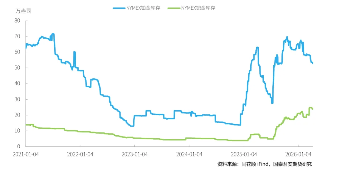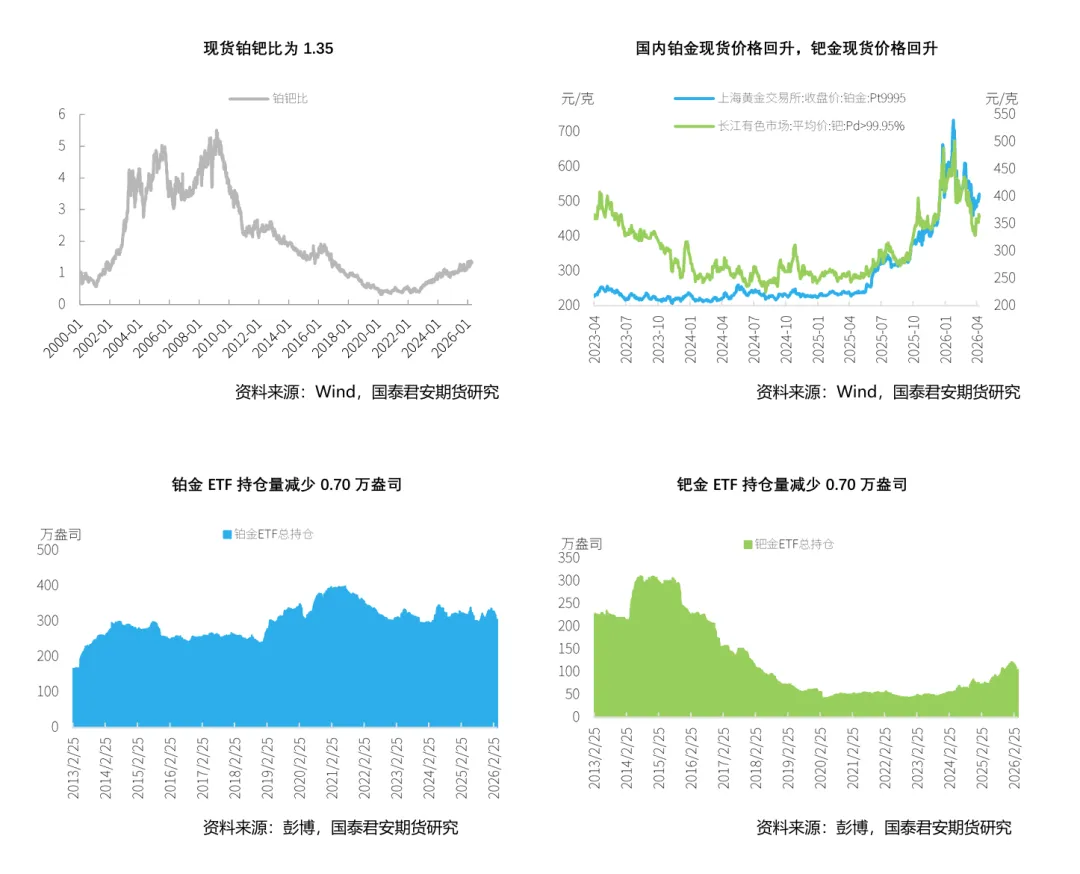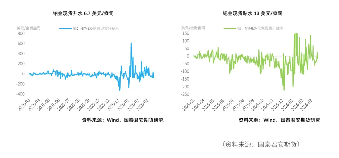 截至2026年4月10日,当周NYMEX铂金库存去库0.76万盎司,钯金期货库存去库。在现货升贴水方面,本周铂金升贴水有所波动,以周五收盘价来看升水6.7美元/盎司。钯金同样波动,周五贴水13美元/盎司。ETF持仓量情况,铂金持仓量回落,其全球ETF持仓量本周减少0.70万盎司,钯金持仓量抬升,ETF持仓量本周增加1.21万盎司。