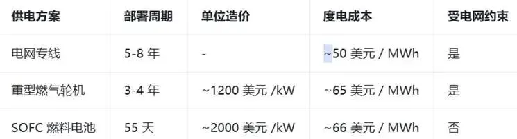 SOFC度电成本只比工业用电贵16美元/MWh,但能让数据中心提前3年用上电。