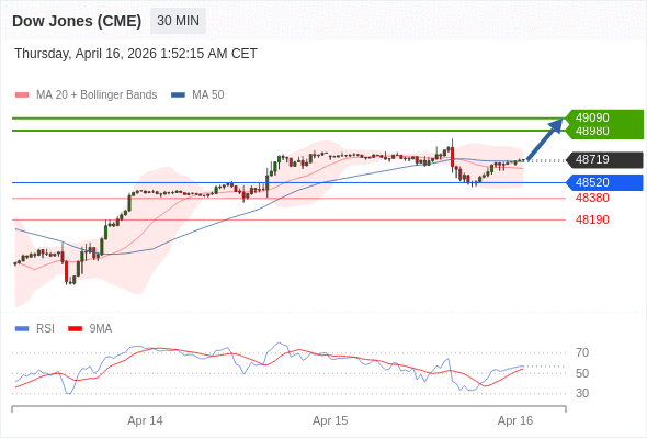 道琼斯指数 (CME) : 在 48520 之上,看涨,目标价位为 48980 ,第二目标价为 49090 。