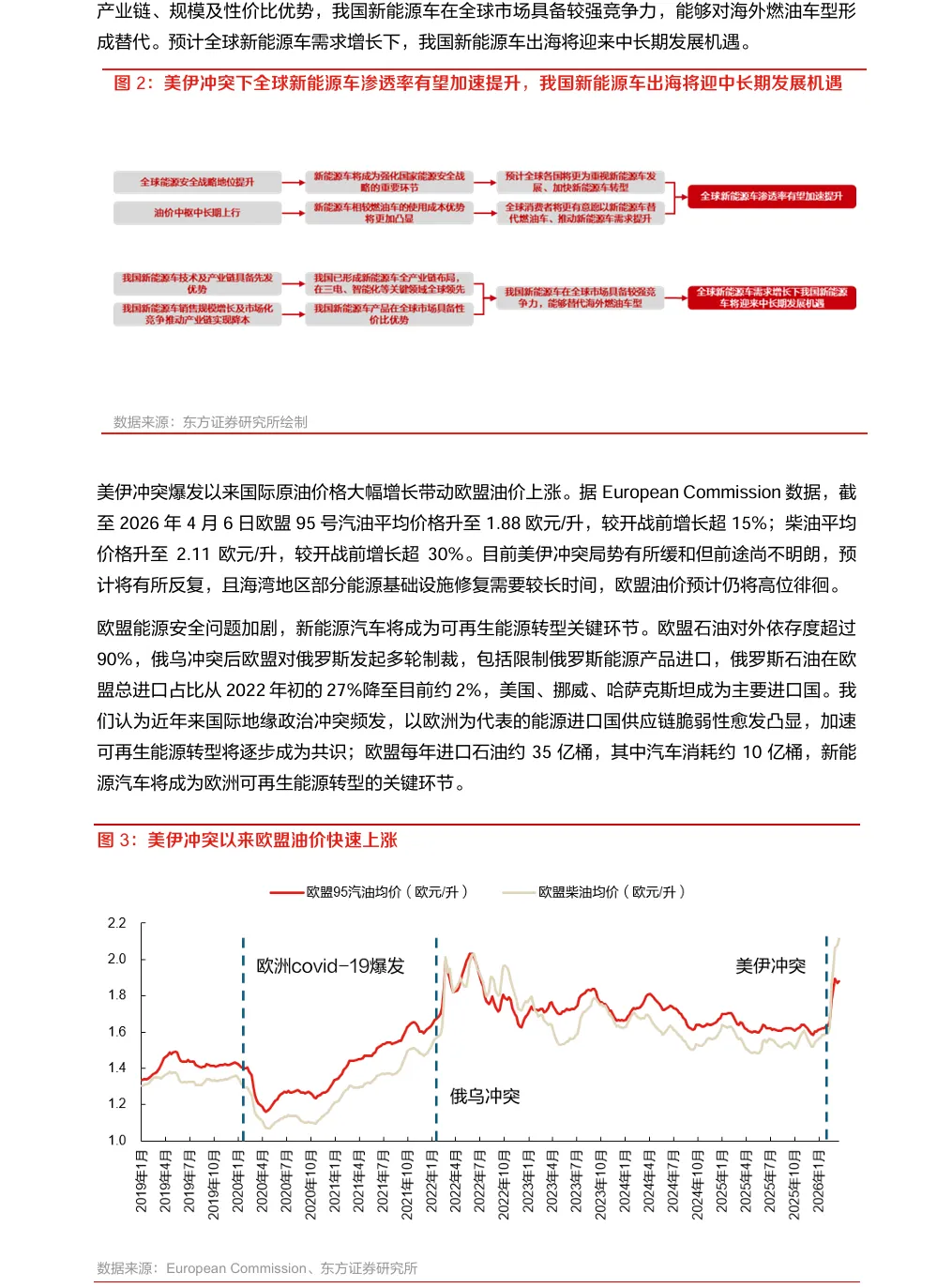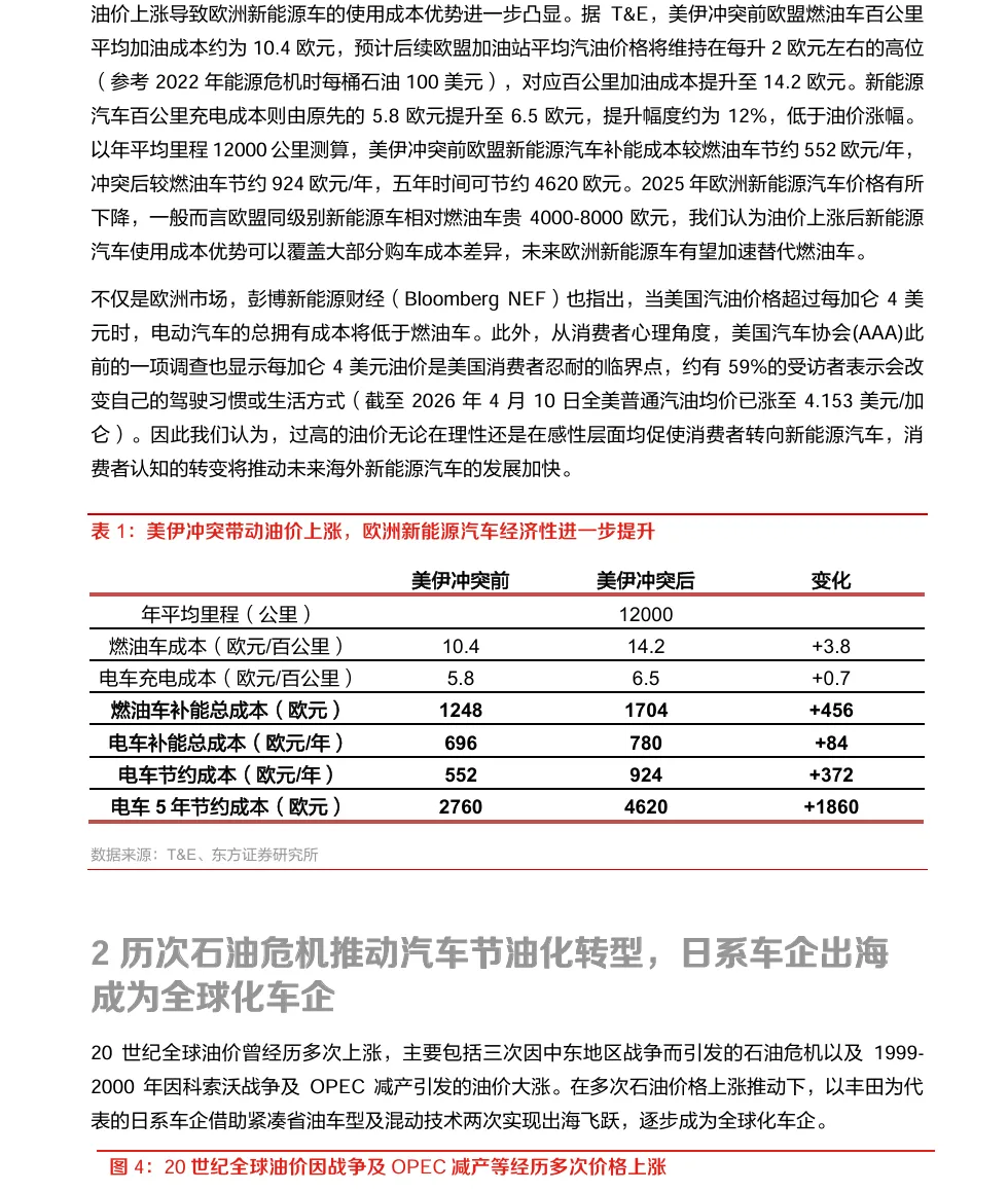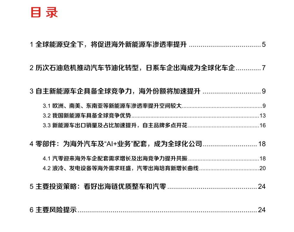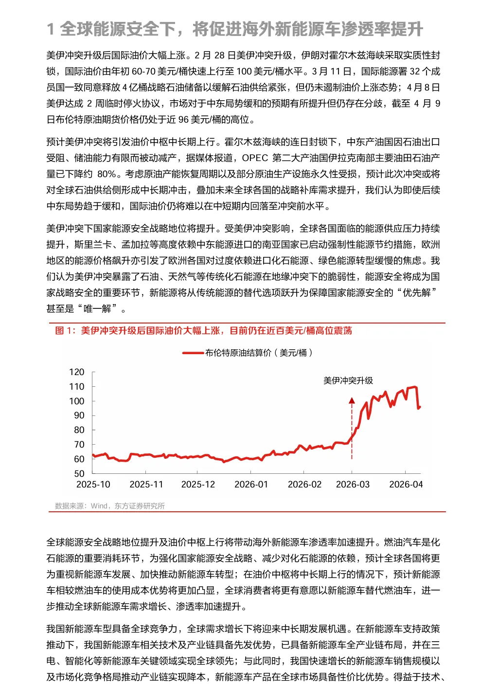 摘要:能源安全与油价中长期上行推动全球新能源车渗透率加速提升,海外市场仍处蓝海,中国自主新能源车凭借技术、产业链、成本优势迎来出海大机遇。参考石油危机后日系车企全球化路径,比亚迪、吉利等有望成长为全球车企。汽车零部件跟随整车出海,同时切入数据中心液冷、燃气发电等AI+海外供应链,打开第二增长曲线。行业维持中性,推荐比亚迪、吉利等整车龙头,以及拓普集团、三花智控、银轮股份等全球化零部件标的。风险提示:海外需求、政策、竞争格局不及预期。