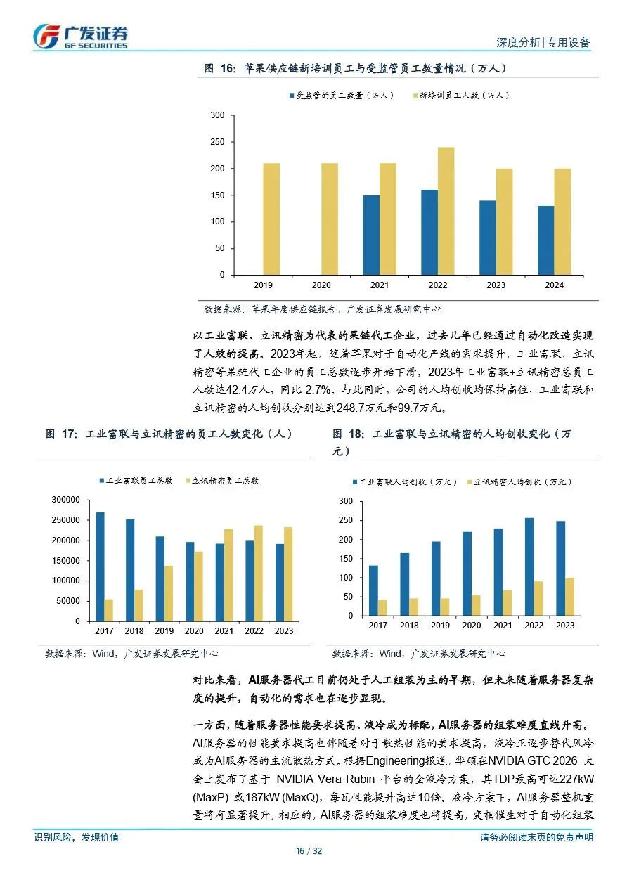 服务器市场,特别是AI服务器领域,正经历着深刻的变革。随着AI算力的不断提升,服务器性能要求日益严苛,液冷等高效散热方案逐渐成为主流,这极大地增加了服务器的组装难度,对产线自动化提出了更高要求。尽管当前AI服务器组装仍以人工为主,但借鉴“果链”企业的发展路径,未来自动化产线的普及将成为大势所趋。自动化组装不仅能显著提升生产效率,还能有效降低人力成本,满足AI服务器大规模出货的需求。因此,服务器自动化组装设备市场前景广阔,相关设备厂商有望迎来新的增长点。