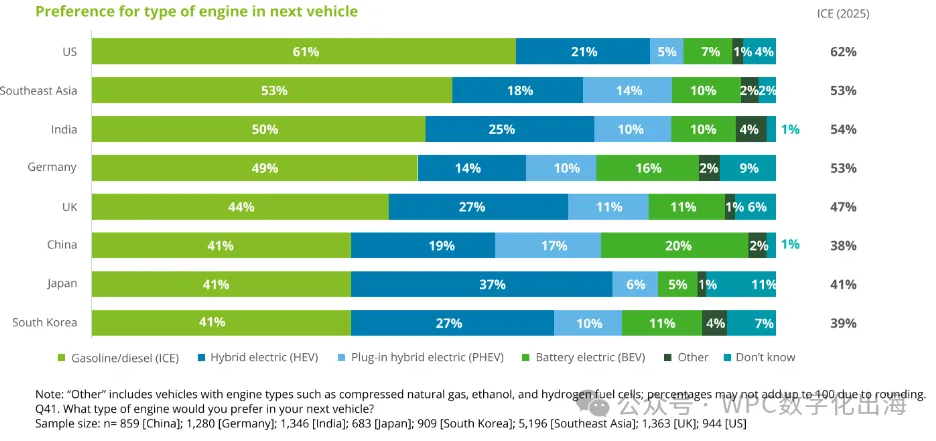 日本市场的用户品牌忠诚度表现格外突出,比例达到 51%;而英国、美国、韩国和德国的消费者,在换车时更愿意尝试不同品牌,转换意愿明显更强。