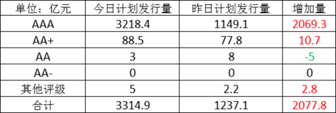 今日存单计划发行量规3314.9亿元,较上一工作日计划发行量大幅增加,增加了2077.8亿元。