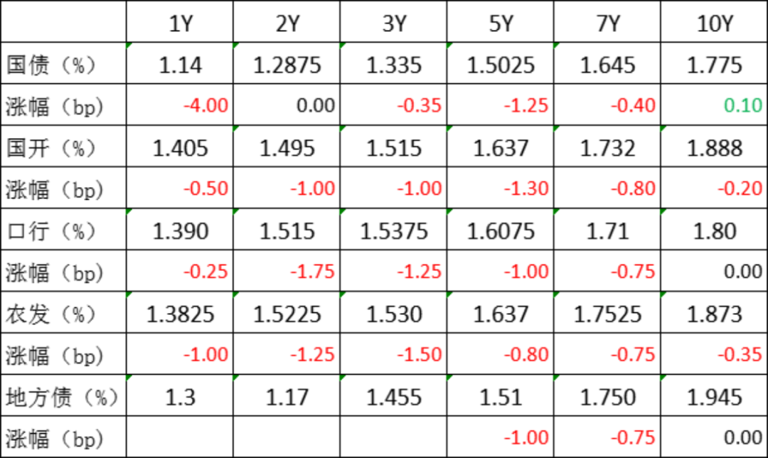 截止17:10,利率债二级市场中,利率成交价格总体呈下跌趋势,其中下跌程度较大的有1年期国债,收益率下跌4bp,报1.14%;2年期口行债,收益率下跌1.75bp,报1.515%;5年期国债,收益率下跌1.25bp,报1.5025%,5年期国开债,收益率下跌1.3bp,报1.637%。