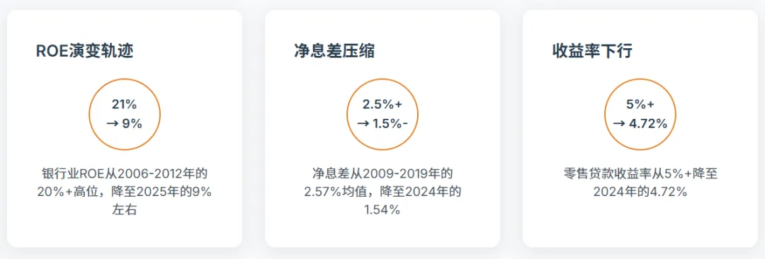 中国银行业ROA与ROE的二十年演变轨迹,清晰勾勒出房贷业务从"黄金年代"步入"效率困境"的历史进程。2006-2012年间,银行业处于高速扩张期,ROA维持在1.0%以上高位,ROE普遍超过20%,部分股份制银行甚至达到25%以上。2012年成为重要转折点,此后盈利能力指标进入趋势性下行通道。