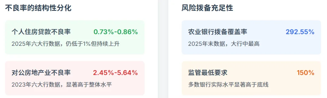 拨备覆盖率是衡量银行风险抵补能力的核心指标,其变化反映了银行对房地产贷款风险的前瞻判断和应对准备。监管要求拨备覆盖率基本标准为150%,但多数银行实际水平显著高于这一底线。2025年末,农业银行拨备覆盖率最高,达292.55%;建设银行233.15%、邮储银行227.94%、工商银行213.6%、中国银行200.37%、交通银行208.38%。